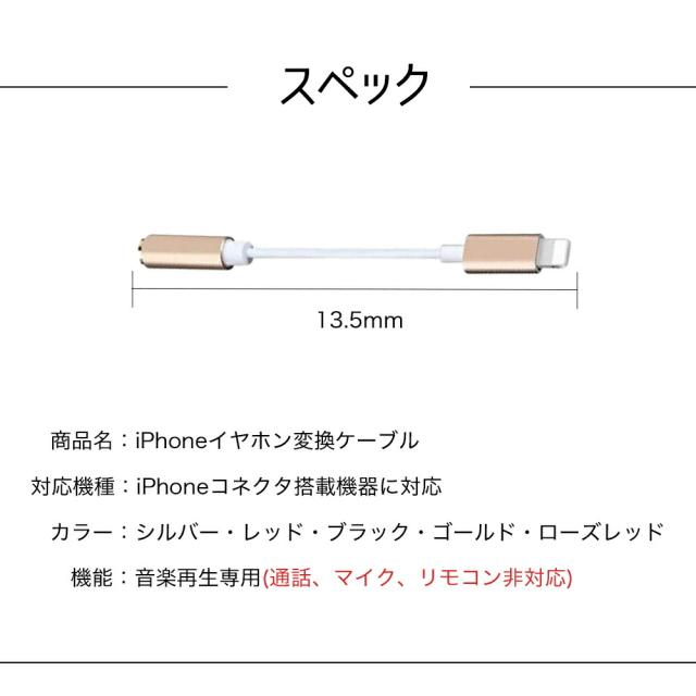 | 商品説明 | 【イヤホン変換ケーブル3.5mmがあなたの音楽ライフを豊かに♪】 【高い汎用性を持つ変換アダプター】 このiPhoneイヤホン変換アダプターは、充電ポートを経由してLightning3.5mmオーディオジャックへ音声を出力することができます。iOS14以降のiPhoneだけでなく、iPadにも対応しているため、幅広い機種でお使いいただけます。 【スタイリッシュなデザイン】 iPhone 3.5mm変換ケーブルは、シルバー、レッド、ブラック、ゴールド、ブルーの5色展開。どんなデバイスにも合わせやすいカラーバリエーションで、おしゃれに楽しめます。 【コンパクトで使い勝手の良いサイズ】 Lightningイヤホン変換ケーブルは、長さ約15cmとコンパクトなサイズ。持ち運びにも便利で、いつでもどこでも音楽を楽しむことができます。 【イヤホンジャックが廃止されたデバイスでも活躍】 イヤホンジャックが廃止されたiPhoneやiPadでも、このiPhoneオーディオ変換ケーブルを使えば、お気に入りのイヤホンで音楽を聴くことができます。 【高音質を実現】 3.5mmイヤホンジャック変換を利用することで、クリアな高音質で音楽や動画を楽しむことが可能です。iPhone用イヤホン変換プラグで、お気に入りの音楽を心ゆくまで楽しんでください。 【購入された方々からのレビューを抜粋!】■この変換ケーブルのおかげで、古いイヤホンが使えるようになりました。音質も良好で、大満足です。 ■対応機種 (iPhone) iPhone 14 Pro / iPhone 14 Pro Max / iPhone 14 Plus / iPhone 14 iPhone 13 Pro / iPhone 13 Pro Max / iPhone 13 mini / iPhone 13 iPhone SE3 (第3世代) / SE2 (第2世代)、SE (第1世代) iPhone 12 Pro / iPhone 12 Pro Max / iPhone 12 mini / iPhone 12 iPhone 11 Pro / iPhone 11 Pro Max / iPhone 11 iPhone XS / iPhone XS Max iPhone X / iPhone XR iPhone 8 / iPhone 8 Plus iPhone 7 / iPhone 7 Plus iPhone 6s / iPhone 6s Plus iPhone 6 / iPhone 6 Plus iPhone 5s / iPhone 5c / iPhone 5 ■対応機種 (iPad) iPad Pro [12.9インチ] (第2世代) / (第1世代) iPad Pro [10.5インチ] iPad Pro [9.7インチ] iPad Air (第3世代) / iPad Air 2 / iPad Air (第1世代) iPad (第9世代) / (第8世代) / (第7世代) / (第6世代) / (第5世代) / (第4世代) iPad mini (第5世代) / iPad mini 4 / iPad mini 3 / iPad mini 2 / iPad mini (第1世代) ■色のバリエーションが豊富で、自分のiPhoneに合わせたカラーが選べて嬉しいです。 ■コンパクトで持ち運びに便利。外出先でも使えて重宝しています。 ■価格も手頃で、品質も期待以上。買って良かったと思います。 【商品詳細】カラー:シルバー レッド ブラック ゴールド ブルー 長さ:約15cm 変換 ケーブル3.5mmは、機能性とデザイン性を兼ね備えたアイテムです。Lightning 3.5mm変換アダプターを使って、イヤホンで音楽を楽しみたい方におすすめです。ぜひお試しください。 【注意事項】※本商品には説明書が付属しておりません。使用方法に関しては商品ページをご参照ください。 ※商品画像はご覧になっているモニターやPCなどの環境、解像度により、実物と多少カラーが異なる場合がございます。色味やサイズが異なるなどのクレームはご対応致しかねますので、予めご了承ください。 ※輸送中に外装に傷やへこみが起こる場合がございますが、商品に影響はございませんので、予めご了承のもとお買い求めください。 ※本商品は海外からの輸入品ですので、細かい傷や汚れなどある場合がございます。予めご了承のもとお買い求めください。 ※こちらの商品は安価にご提供するため、簡易包装、簡易パッケージとなっております。 ※すべてのオーディオ、スマートフォンでの動作を保証するものではありません。オーディオ、スマートフォンのバージョンやメーカー、機器の仕様変更、互換性等により正常に動作しない場合があります。 ※使用中に『このアクセサリは使用できない可能性があります』が表示される場合、一度スマホの電源を切って、再起動してから、何度かケーブルを挿し直してください。 ※商品改良の為、本商品のケーブルの長さ、カラー、仕様につきましては、予告なく変更させていただく場合がございます。 ※本体や付属品が水に濡れると故障の原因となりますので、汚れた場合はウェットティッシュや濡れタオルを使って汚れを拭き取ってください。 ※本商品を使用した事による、直接もしくは間接的に生じた損害、データの破損、事故、怪我について当店は一切の責任を負いません。 ※本商品は小さな部品を使用しております。誤飲等の危険性があるため、お子様がご利用になる場合は大人の方と一緒にご使用頂き、お子様の手の届かない場所で保管してください。 ※本商品は正規品ではございませんので、予めご了承のもとお買い求めください。 ※使用中は若干のノイズが発生する可能性がございます。高音質を求めるお客様は、購入をお控えください。 ※本商品の動作確認はAPPLE純正イヤホンのみ検証済です。すべてのイヤホンの使用を保証するものではございません。 ※ゲームアプリ、通話機能、マイク機能、リモコン操作には対応しておりませんので、予めご了承ください