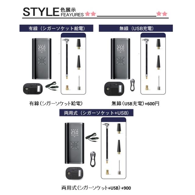 - 商品説明内容には注意すべし。 ワイヤードタイプとワイヤレスタイプと両方 タイプ別に価格が違い表示価格はワイヤードタイプで何とリチウムバッテリーは搭載していない。 そのため、車載のシガーソケットに接続しないとコンプレッサーは動作しない。付属のシガー電源長さは約3メートルで実利用は浮き輪やボール程度だろう。 商品交換依頼すると2千円強経費かかるため諦めた。 よって実際使用していないので性能はわからない、 自転車用にと思ったが銭失いだった。別メーカーの商品を別サイトで改めて購入した。