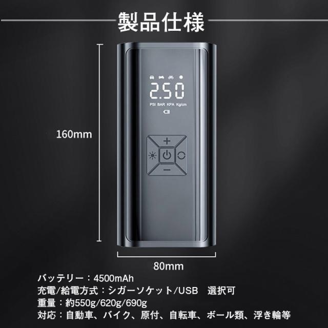 電動 空気入れ 自動車 エアーポンプ 充電式 車 バイク 自転車 ボール タイヤ 浮き輪 USB コンプレッサー 軽量 小型 事故 防止 防災 懐中電灯