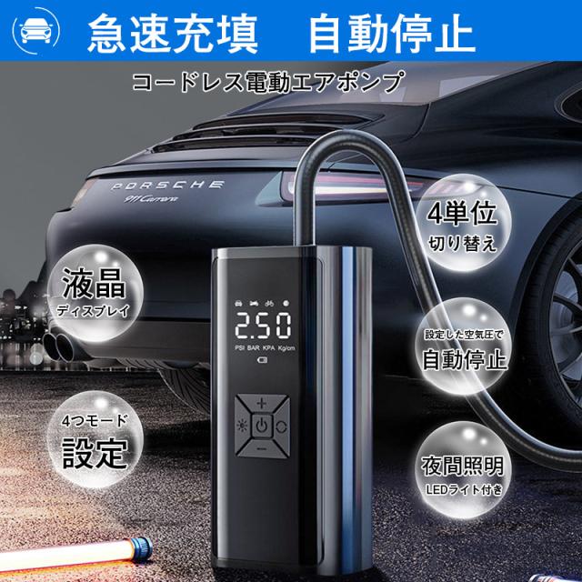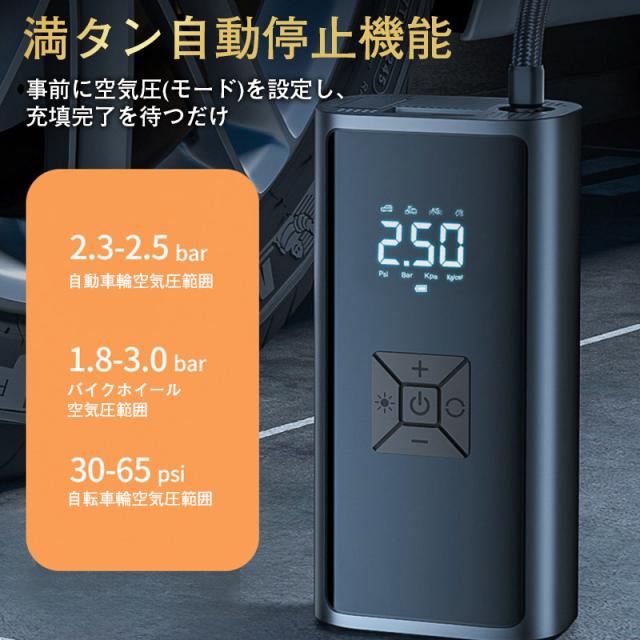充電式の電動空気入れ(エアーポンプ)、急速充填、自動停止。自動車、バイク、自転車、ボール、浮き輪等に対応しています。便利なLEDライト付き(SOSモード搭載)。
