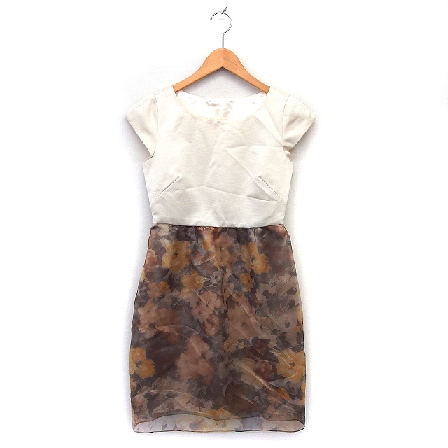 【中古】ワンピース フレア ひざ丈 シフォン 花柄 ボートネック サイドジップ 半袖 ベージュ 茶 ブラウン /NT36 N