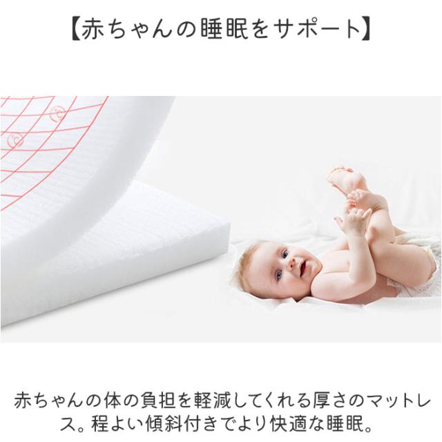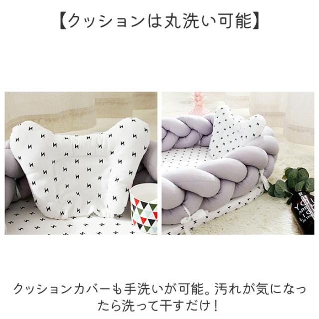 | 商品説明 | 【大人用ベッドでスペースを確保】 ・赤ちゃんが寝るスペースを確保できるベッドインタイプのベビーベッド!落下防止にも◎ 【デリケートな赤ちゃんの肌に】 ・通気性、手触りが良い綿素材を使用しているから、肌がデリケートな赤ちゃんも安心。 【赤ちゃんの睡眠をサポート】 ・赤ちゃんの体の負担を軽減してくれる厚さのマットレス。程よい傾斜付きでより快適な睡眠。 【クッションガード付きで寝返り対策】 ・三本編みのクッションをグルっと一周させて、寝返りや落下を防ぐ作り。 【シーンに合わせて取り外せる】 ・クッションはリボンで着脱が可能!取り外してベビーベッドの柵に付けるのもおススメ♪ 【カバーの洗濯OK】 ・マットレスのカバーはファスナーで取り外しでき、定期的に洗えるのも嬉しいポイント。 【クッションは丸洗い可能】 ・クッションカバーも手洗いが可能。汚れが気になったら洗って干すだけ! 【旅行や帰省での使用も】 ・軽く持ち運びやすいのでベビーベッドがない場所での簡易ベッドとして使える♪ 【専用のトートバッグ付属】 ・ベッドを二つ折りにして収納できる、トートバッグ付属。 |
