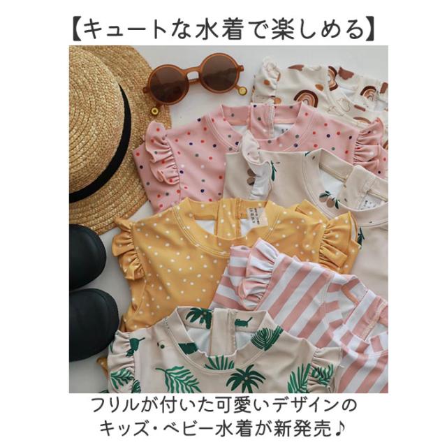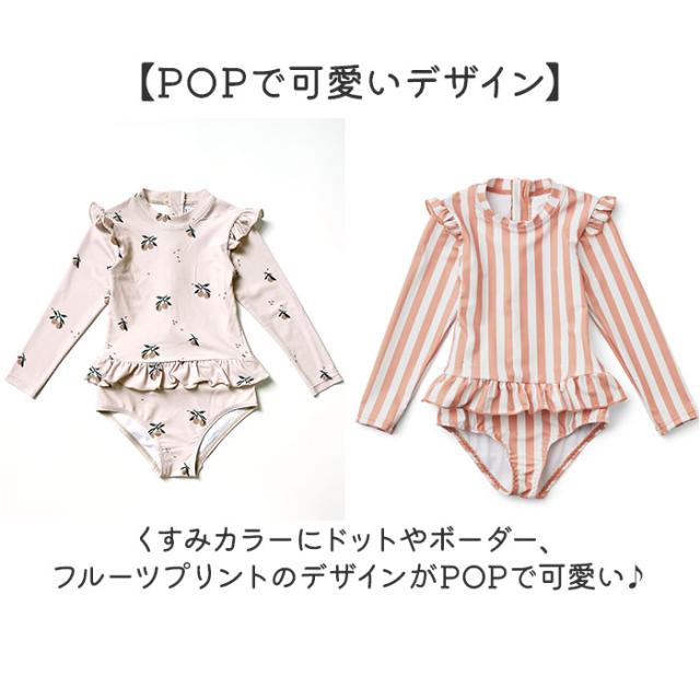 | 商品説明 | 【キュートな水着で楽しめる】 ・フリルが付いた可愛いデザインのキッズ・ベビー水着が新発売♪ 【POPで可愛いデザイン】 ・くすみカラーにドットやボーダー、フルーツプリントのデザインがPOPで可愛い♪ 【露出を控えたワンピースタイプ】 ・長袖かつ、お腹が出ないワンピースタイプの水着。日よけやけが防止にも! 【お着替えが楽なファスナー】 ・濡れたままでもお着替えがスムーズにできるバックファスナー。 【嬉しいUPF50+機能も】 ・気になる紫外線をカットしてくれるUPF50+機能。長時間のプールや海遊びも安心☆ 【帽子付き】 ・水着と同色同柄の帽子付き。水着コーデがバッチリ決まる! 【幅広いサイズ展開】 ・姉妹やお友達とお揃いができるサイズ展開♪可愛い水着で水遊びをもっと楽しめる。 |
