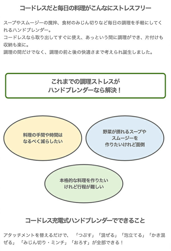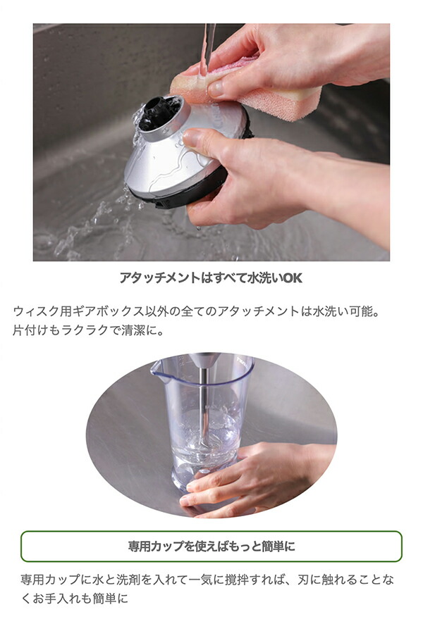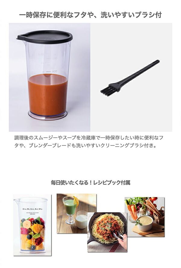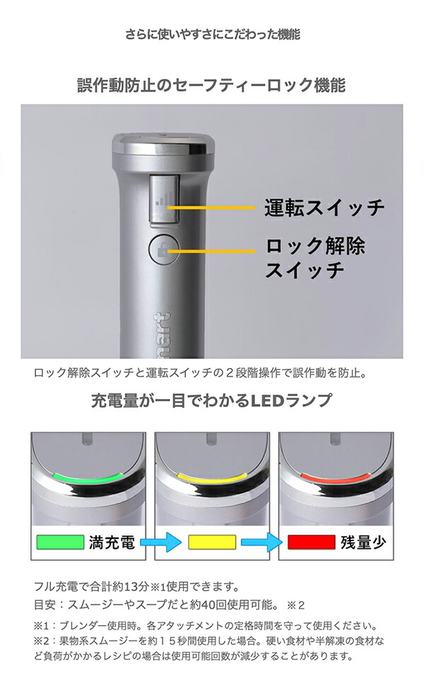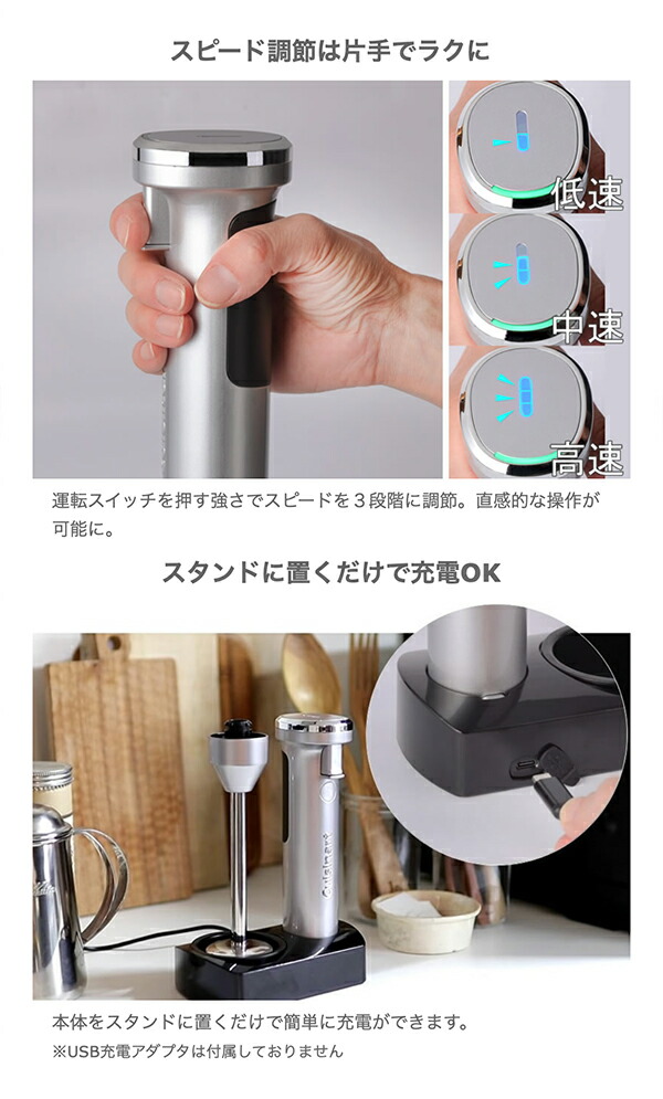 コードレスだと毎日の料理がこんなにストレスフリー スープやスムージーの撹拌、食材のみじん切りなど毎日の調理を手軽にしてくれるハンドブレンダー。 コードレスなら取り出してすぐに使え、あっという間に調理ができ、片付けも収納も楽に。 調理の間だけでなく、調理の前と後の快適さまで考えられ誕生しました。 コードレス充電式ハンドブレンダーでできること アタッチメントを替えるだけで、「つぶす」「混ぜる」「泡立てる」「かき混ぜる」「みじん切り・ミンチ」「おろす」が全部できる! 【クイジナートの使いやすさのポイント】 クイジナート最軽量モデル※1 本体はわずか530g※2でクイジナート最軽量モデル。バッテリー内蔵でも驚きの軽さで、調理中も腕が疲れることなくストレスフリーに使えます。 ※1:当社従来比 ※2:ブレンダー使用時 コードレスでもパワー十分。DCモーター搭載 コード付きと比べてパワーが心配になるコードレスでも、パワフルに使えるDCモーターを搭載。 充電式で不安に感じるパワー不足もクイジナートなら心配無用です。 撹拌力にすぐれたブレンダーデザイン 食材の混ざりやすさを追求したブレードガード。 12mmのオーバル形ブレンダーホールと吸引力調整溝によって、効率的にすばやく食材が混ざるよう設計しました。 手にフィットするグリップデザイン 握りやすいスリムなボディと人間工学に基づいた手にフィットするデザイン設計。ロック解除スイッチと運転スイッチが直感的に操作でき、スムーズに調理ができます。 飛び散り防止の低速スピード 撹拌スピードは3段階で調節可能。低速からスタートできるので飛び散りが防げます。 お鍋でのスープ作りやお菓子作りの時にストレスなく調理ができます。 動作音を約15%低減※ 本体内部の振動を最小限になるよう設計したことで、従来モデルより動作音を約15%低減※。音を気にせず使えます。 ※:当社コードレス充電式ハンドブレンダーRHB-100Jと比較 コンパクトに収納できる充電スタンド付き 使い終わったら立てて置いておけるスタンド付き。そのまま充電もできて、キッチンに出したままにできるから、サッと取り出せてサッとしまえます。 アタッチメントはすべて水洗いOK ウィスク用ギアボックス以外の全てのアタッチメントは水洗い可能。 片付けもラクラクで清潔に。 さらに使いやすさにこだわった機能 ・誤作動防止のセーフティーロック機能 ・充電量が一目でわかるLEDランプ ・スピード調節は片手でラクに ・スタンドに置くだけで充電OK ・一時保存に便利なフタや、洗いやすいブラシ付
