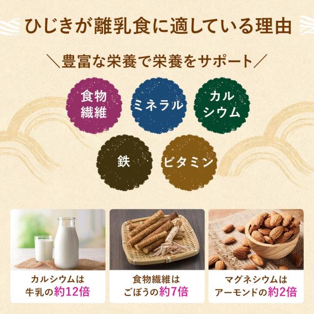 | 栄養分析 (100gあたり) | エネルギー:149kcal、たんぱく質:9.2g、脂質:3.2g、糖質:6.6g、食物繊維:51.8g、食塩相当量:4.7g、カルシウム:1000mg、鉄:6.2mg |