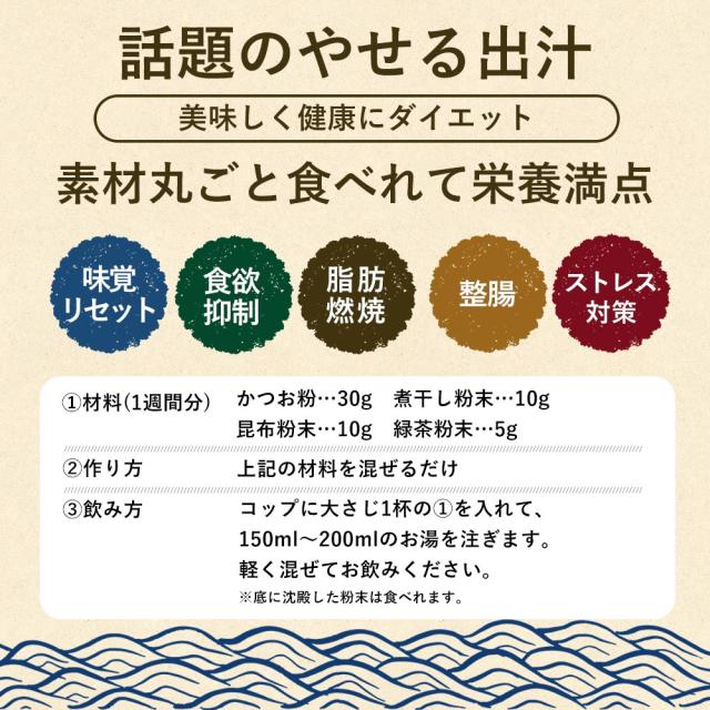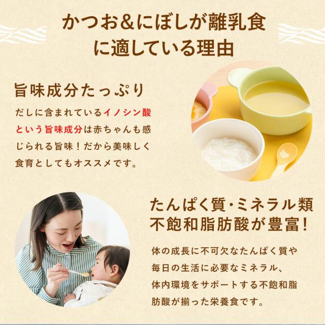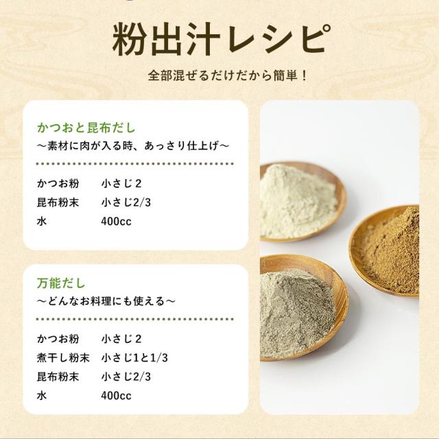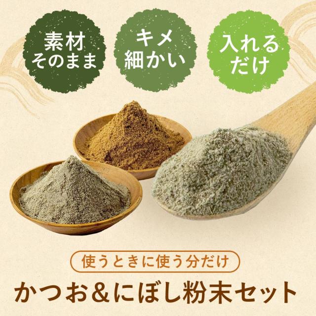 | 栄養分析 (100gあたり) | 【かつお粉】 エネルギー:351kcal たんぱく質:75.7g 脂質:3.2g ナトリウム:480mg カルシウム:46mg マグネシウム:91mg 鉄:9.0mg 亜鉛:2.5mg 【煮干し粉末】 エネルギー:303cal たんぱく質:65.7g 脂質:4.0g ナトリウム:2800mg 炭水化物:1.0g (食塩相当量:7.6g) |