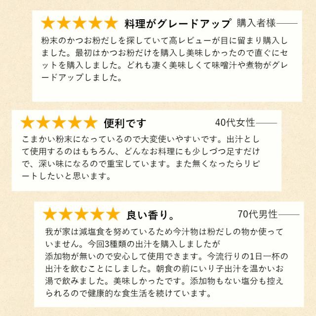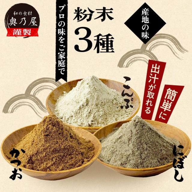 | 内容量 | 【かつお粉】【昆布粉末】【煮干し粉末】 100g |