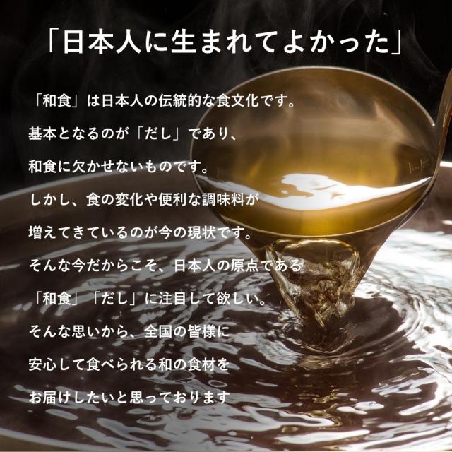 | 栄養分析 (100gあたり) | 【かつお粉】 エネルギー:351kcal たんぱく質:75.7g 脂質:3.2g ナトリウム:480mg カルシウム:46mg マグネシウム:91mg 鉄:9.0mg 亜鉛:2.5mg 【昆布粉末】 エネルギー:140cal たんぱく質:8.3g 脂質:1.5g ナトリウム:3000mg 炭水化物:58.5g (食塩相当量:7.6g) 【煮干し粉末】 エネルギー:303cal たんぱく質:65.7g 脂質:4.0g ナトリウム:2800mg 炭水化物:1.0g (食塩相当量:7.6g) |