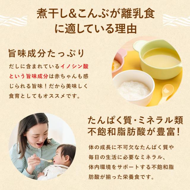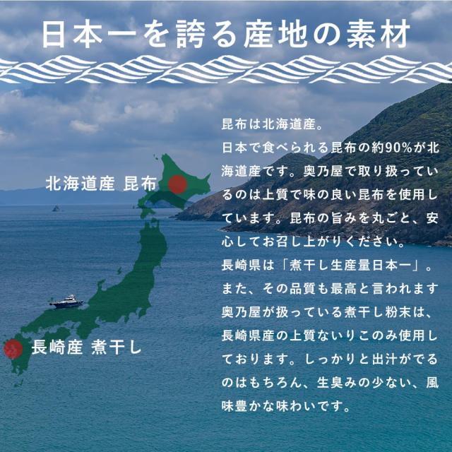 | 栄養分析 (100gあたり) | 【昆布粉末】 エネルギー:140cal たんぱく質:8.3g 脂質:1.5g ナトリウム:3000mg 炭水化物:58.5g (食塩相当量:7.6g) 【煮干し粉末】 エネルギー:303cal たんぱく質:65.7g 脂質:4.0g ナトリウム:2800mg 炭水化物:1.0g (食塩相当量:7.6g) |