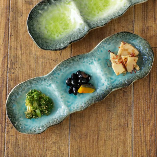 薬味や香物、小鉢三種盛りなどにぴったりな3連の小皿です。釉薬の溜まりに味わいを感じ、器の鮮やかな色彩が食材を引き立ててくれます。