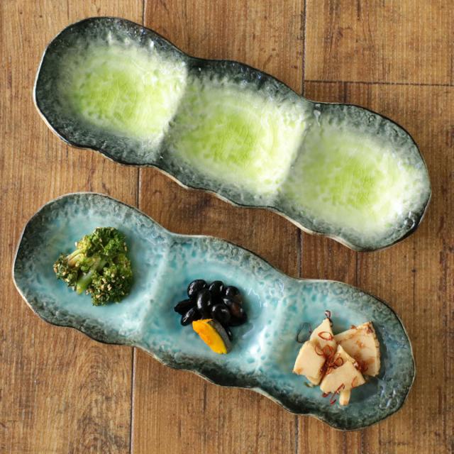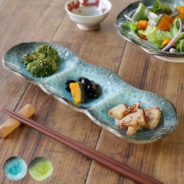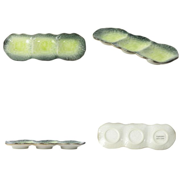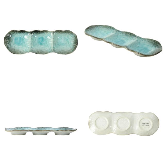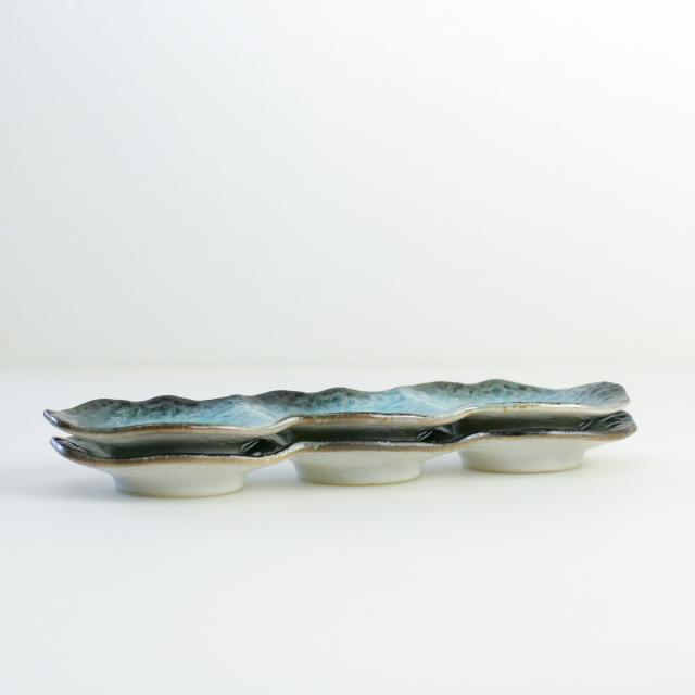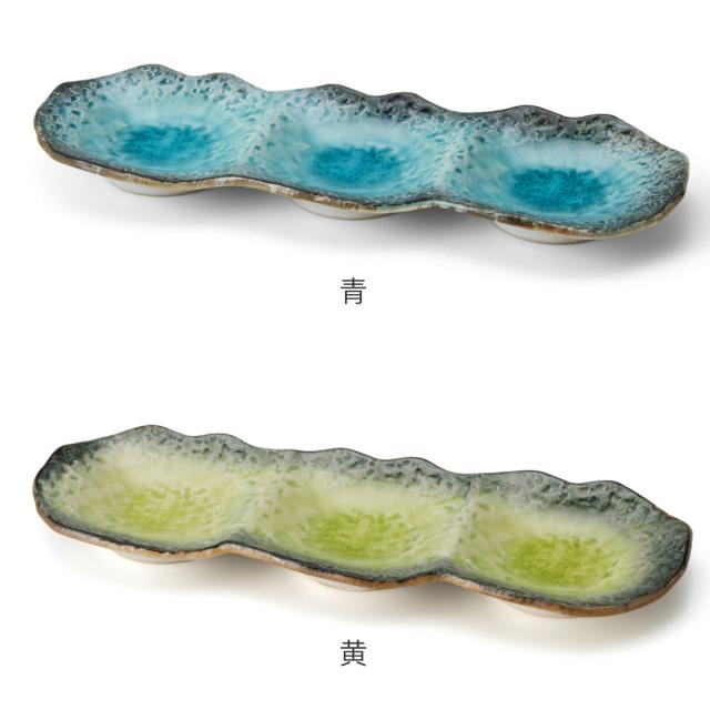 薬味や香物、小鉢三種盛りなどにぴったりな3連の小皿です。釉薬の溜まりに味わいを感じ、器の鮮やかな色彩が食材を引き立ててくれます。
