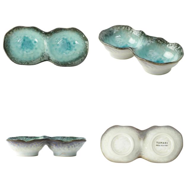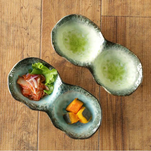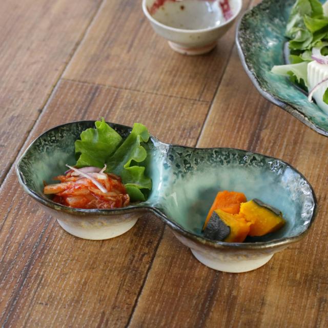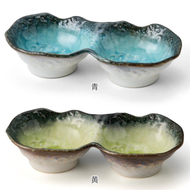 煮物や酢の物などを盛り付けて小付けとしてお使いいただくのにぴったりな2連の小鉢です。釉薬の溜まりに味わいを感じ、器の鮮やかな色彩が食材を引き立ててくれます。