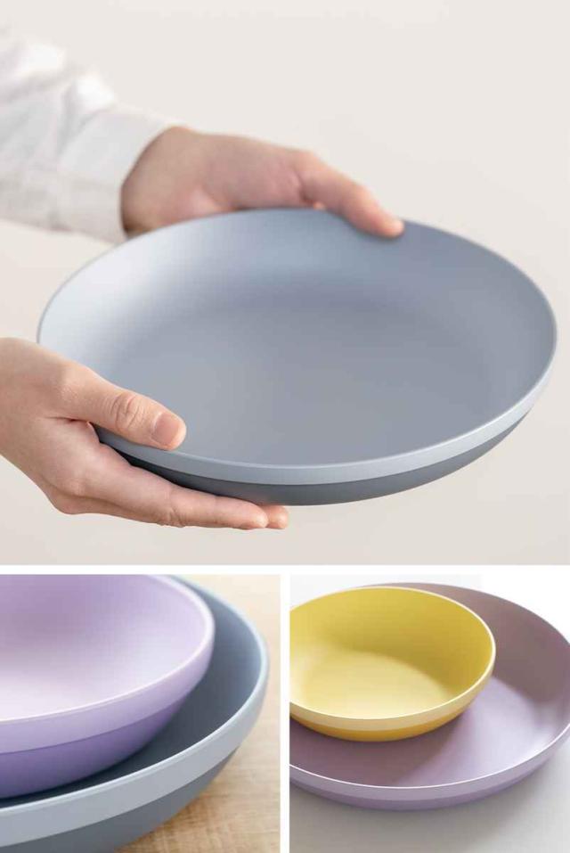 同色系の濃淡2色を使った塗分けは職人の手作業で丁寧に仕上げられています。表面はさらさらとしたマットな質感です。縁に立ち上がりがあるのでソースやドレッシング、汁気の多いおかずも盛り付けられます。