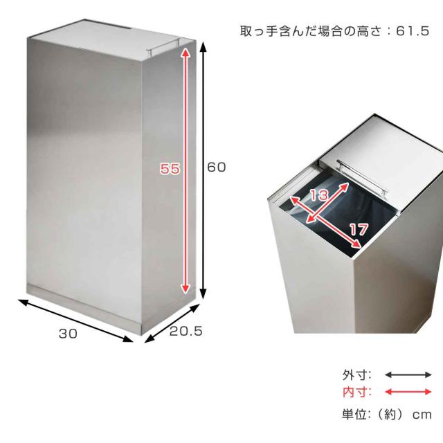 | サイズ | 外寸:約 幅20.5×奥行30×高さ60(cm) 内寸:約 幅16×奥行27×高さ55(cm) 取っ手を含んだ高さ:約61.5(cm) ふたの間口:約幅17×奥行13(cm) |