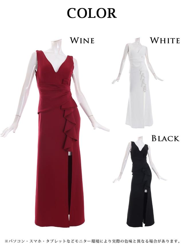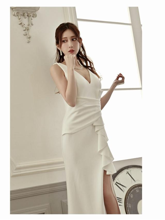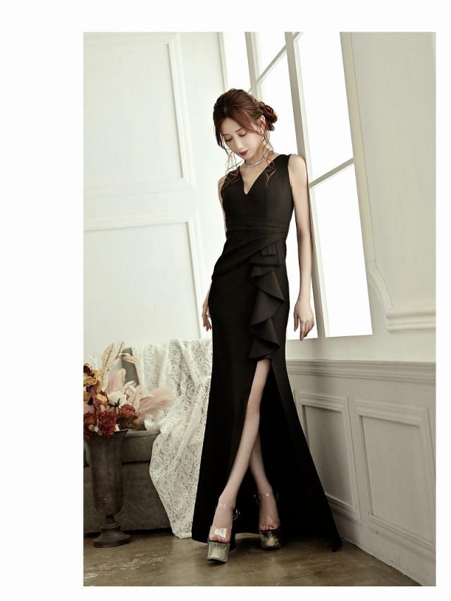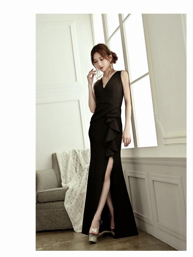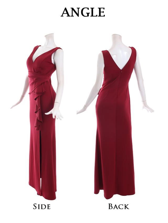 ☆タイトな印象が強いロングドレスも、スリットとフリルのディテールで可愛らしさをプラス!