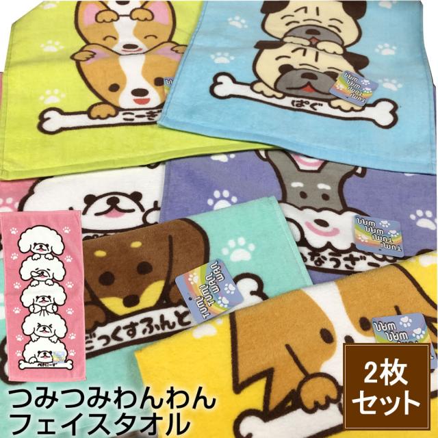ツミツミワンワン フェイスタオル 2枚セット 約34×75cm つみつみわんわん ふわふわ 柔らか シャーリング 染料プリント 犬柄 いぬ わんこ 保育園 幼稚園 粗品 贈答 プレゼント 可愛い 犬の顔柄 TUMI TUMI WAN WAN 犬飼タオル