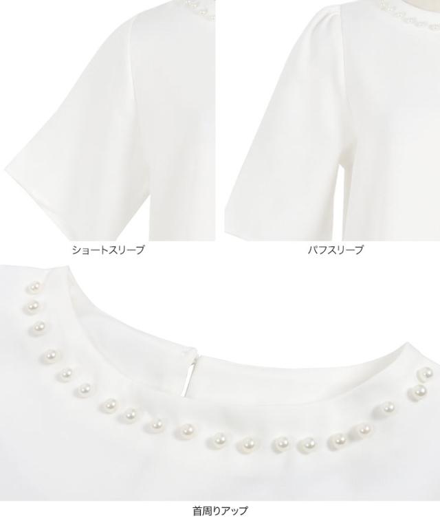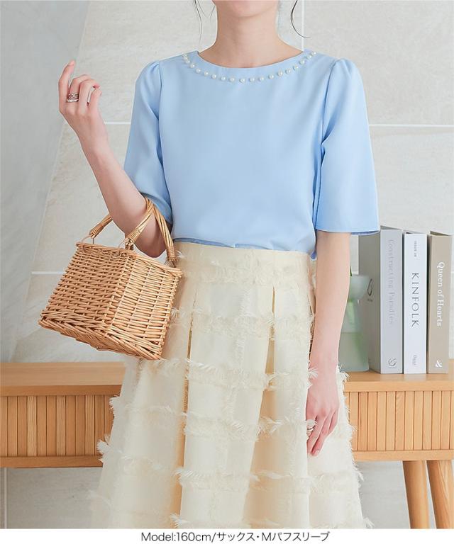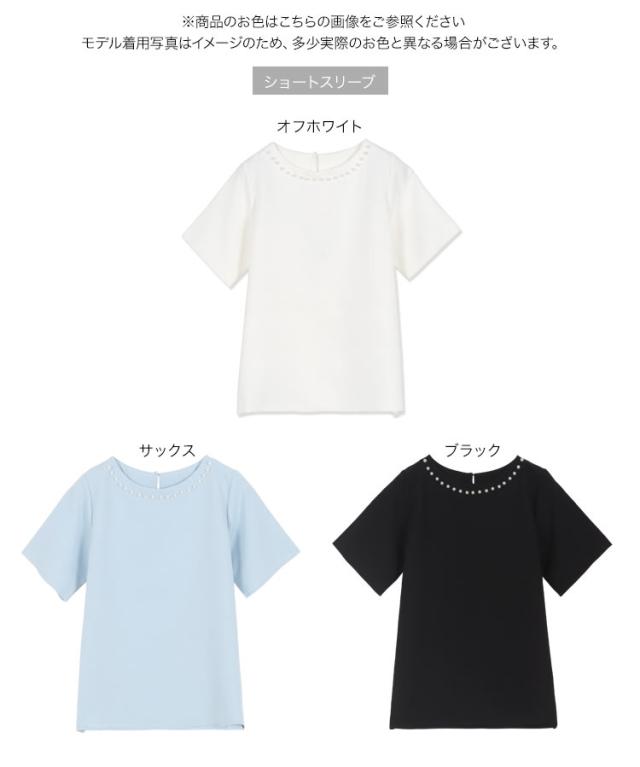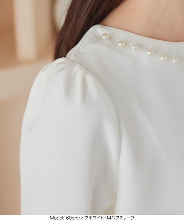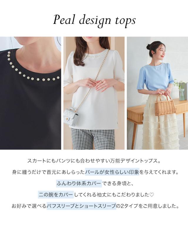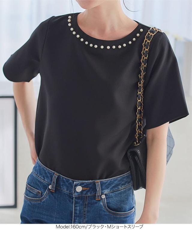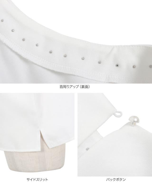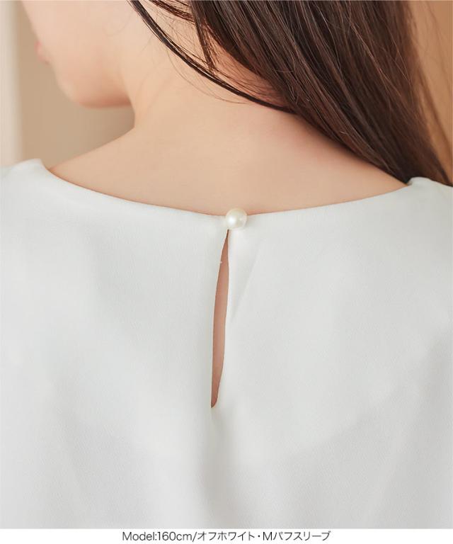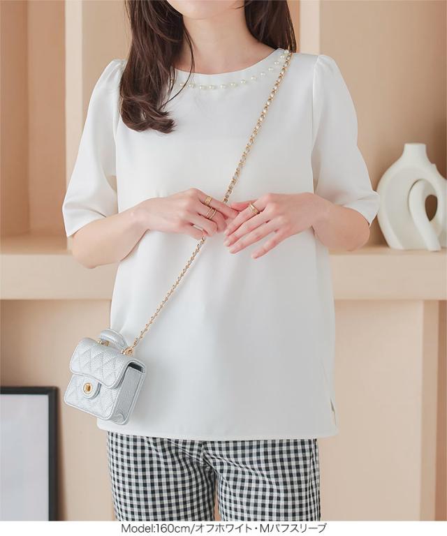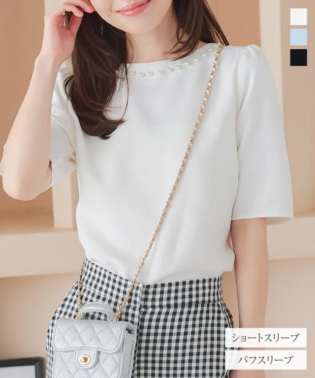 春新作 ネックパールトップス C7101 入荷済 胸元パールブラウス パール トップス ゆったり レディース 半袖ブラウス 首元パールブラウス ノーアクセサリー アクセいらず パフスリーブブラウス ぽわん袖 体系カバー 上品 おしゃれ パールブラウス
