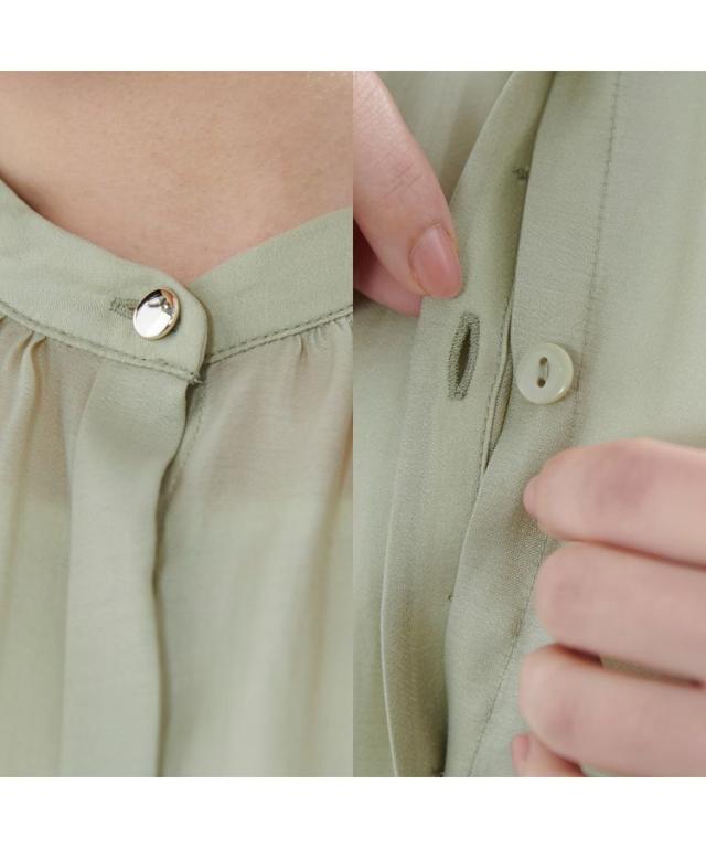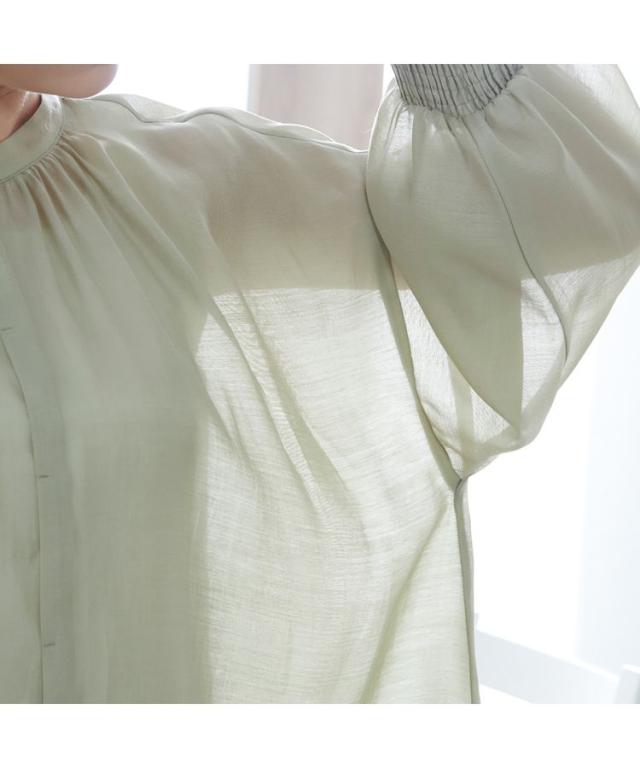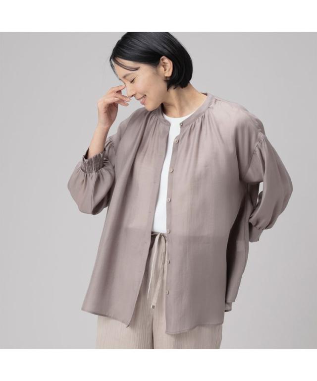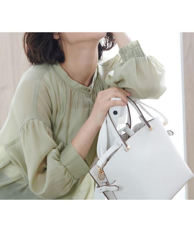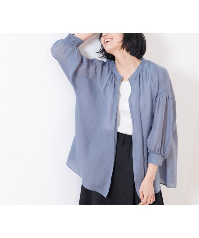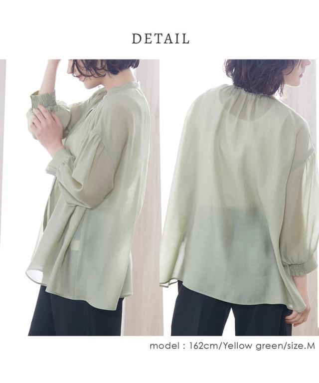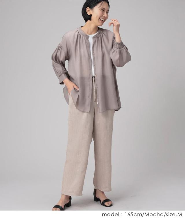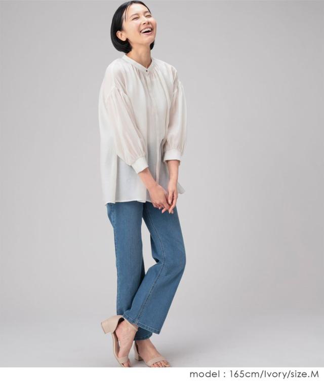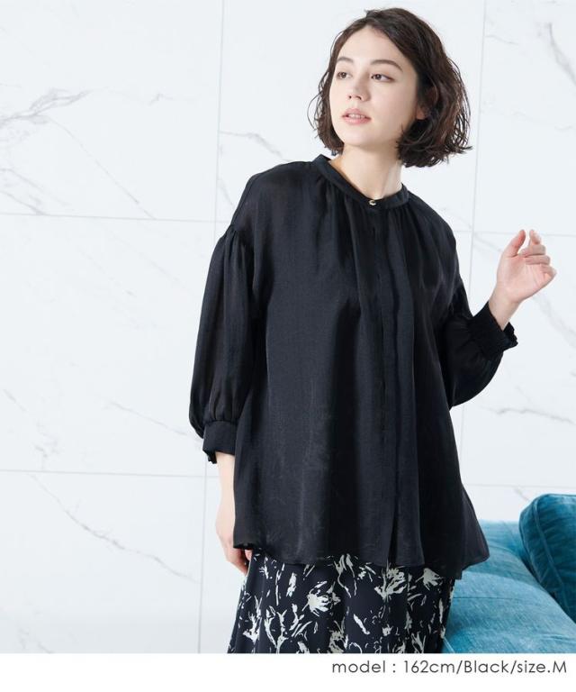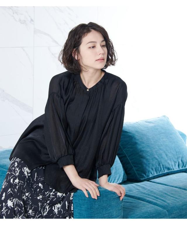 袖口内側のゴムシャーリングで、お好みの袖丈とボリューム感に調節できるデザイン袖。