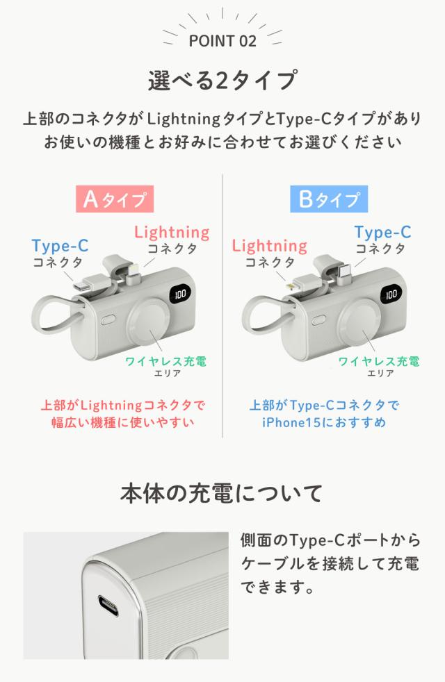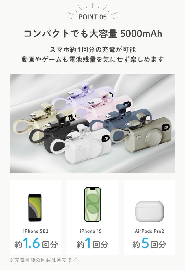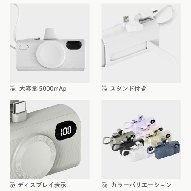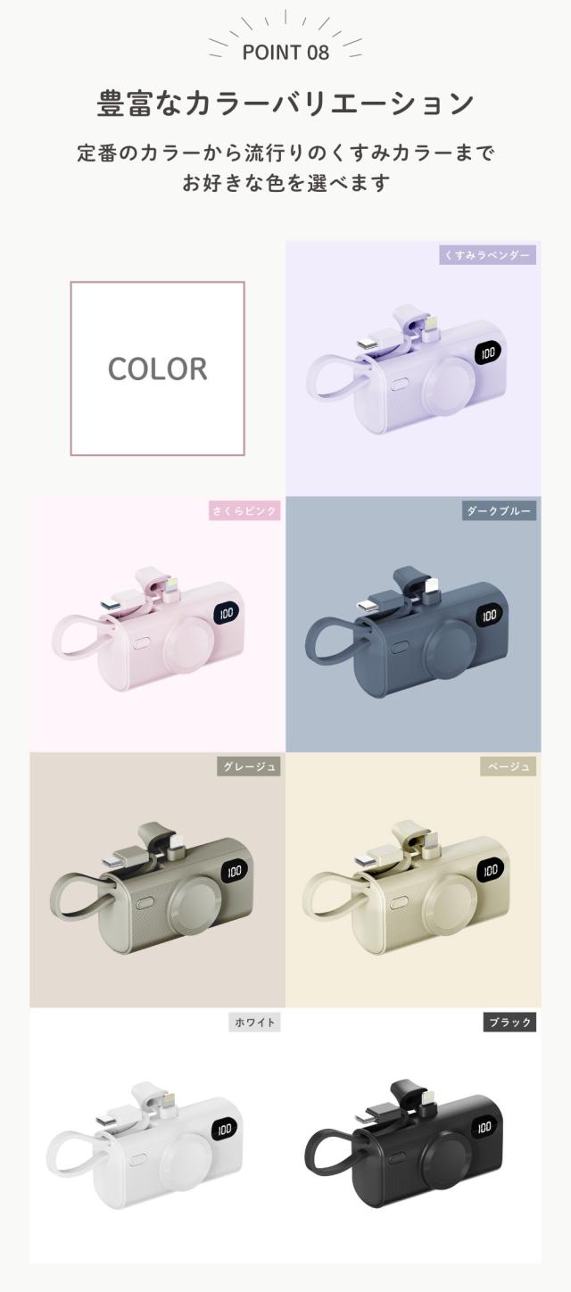 | 対応機種 | iPhone全シリーズ、Type-C充電可能なAndroid端末、Apple Watch Series 1/2/3/4/5/6/7/8/9 & Ultra2 & SE(第2世代)、iPadなどのタブレット、iPodなどの音楽プレーヤー、イヤホン、加熱式たばこなど |