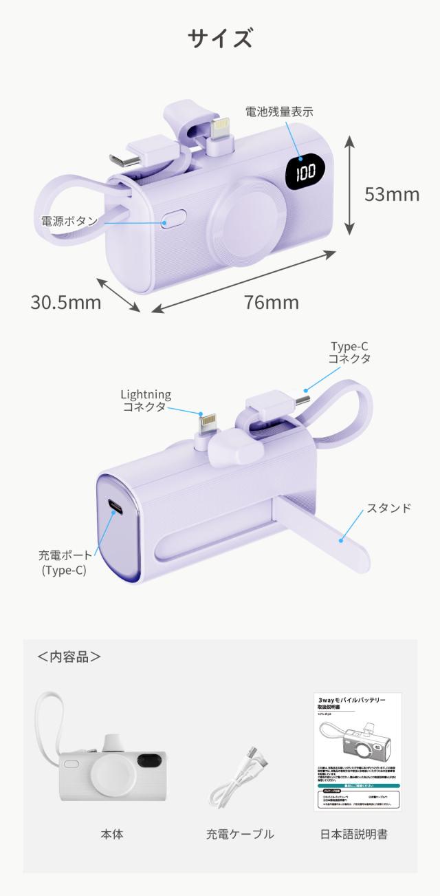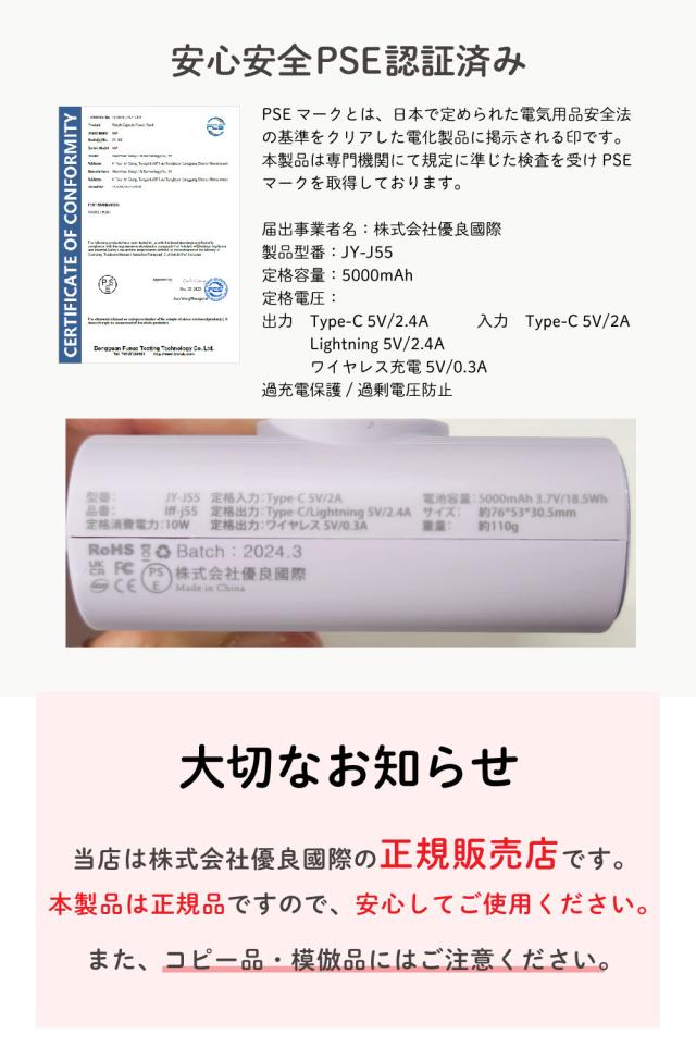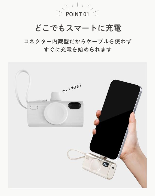 | 商品特徴 | ■業界初!トリプルチャージ対応 本製品1台でiPhone、Type-C、Apple Watchで高速トリプル充電ができます。 外出時やアウトドアはこれ1つでOK!3台のデバイスの同時充電も可能です。 ほぼ全てのスマホ充電に対応しているため、iPhoneだけでなくAndroidでもご使用いただけます。 ■Apple Watch全シリーズ対応 AppleWatchの充電を忘れていた!なんて経験ありませんか? この1台があれば、いつでも・どこでもワイヤレス充電が可能です。 Apple Watch Series 1/2/3/4/5/6/7/8/9 & Ultra2 & SE(第2世代)など幅広い機種に対応しています。 ※ワイヤレス充電はAppleWatchのみ対応 ※スマートウォッチには対応していません ■お好みに合わせて使える2タイプ Aタイプ:上部がLitningコネクタ。幅広い機種に使いやすいタイプです。 Bタイプ:上部がType-Cコネクタ。iPhone15におすすめです。 お使いの機種とお好みに合わせてお選びください。 上部コネクタに差し込むことにより、スタンドもお使いいただけます。 ■大容量!小さくても5000mAh ミニサイズだけど容量たっぷり!電池残量を気にせず安心して外出することができます。 機内持ち込みも可能です。 [充電目安]iPhone SE2:約1.6回分 、iPhone 15:約1回分、AirPods Pro2:約5回分 ※充電可能の回数は目安です。ご利用状況に応じて異なる場合がございます。 ■超軽量!かわいいポケットサイズ コンパクトでポケットにもポーチにもすっぽり!重さもわずか110gと持ち運びに便利です。 ■ディスプレイで電池残量がわかる! 小さいのにディスプレイも搭載。 液晶ディスプレイで電池残量が一目瞭然なのも嬉しいポイントです。 ■充電しながら動画視聴できるスタンド付き スタンドを使うことで、充電しながら動画や通話を楽しむことができます。 使い方に合わせて縦置き、横置きでの利用が可能です。 ■豊富な7カラーラインナップ くすみカラーやグレージュなどの大人可愛いカラーから、ホワイトやブラックなどの定番カラーまで幅広く取り揃えています。 すべりにくいシンプルなデザインは機能性が高いだけでなく、とってもキュートです! ■PSE認証取得済み PSEマークとは、日本で定められた電気用品安全法の基準をクリアした電化製品に掲示される印です。 本製品は専門機関にて規定に準じた検査を受けPSEマークを取得しております。 届出事業者名:株式会社優良國際 製品型番:JY-J55 定格容量:5000mAh 定格電圧:[出力] Type-C 5V/2.4A、Lightning 5V/2.4A、ワイヤレス充電 5V/0.3A [入力] Type-C 5V/2A 過充電保護 / 過剰電圧防止 |