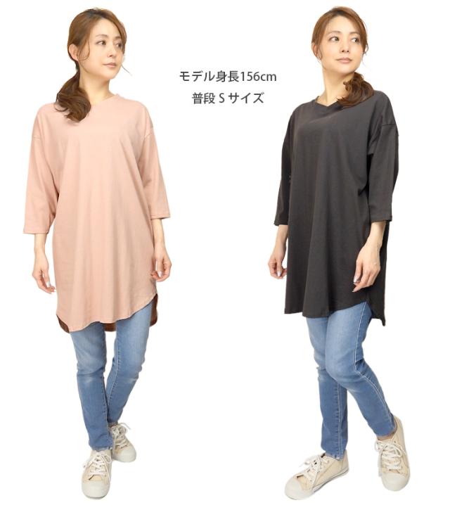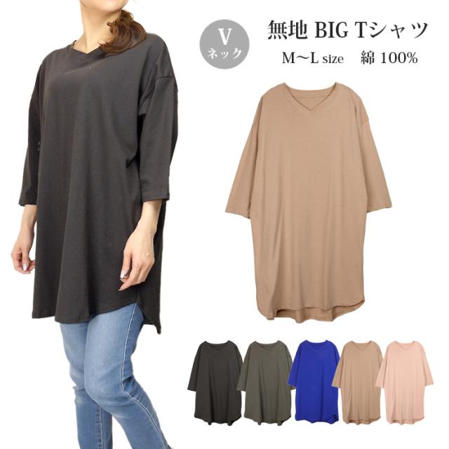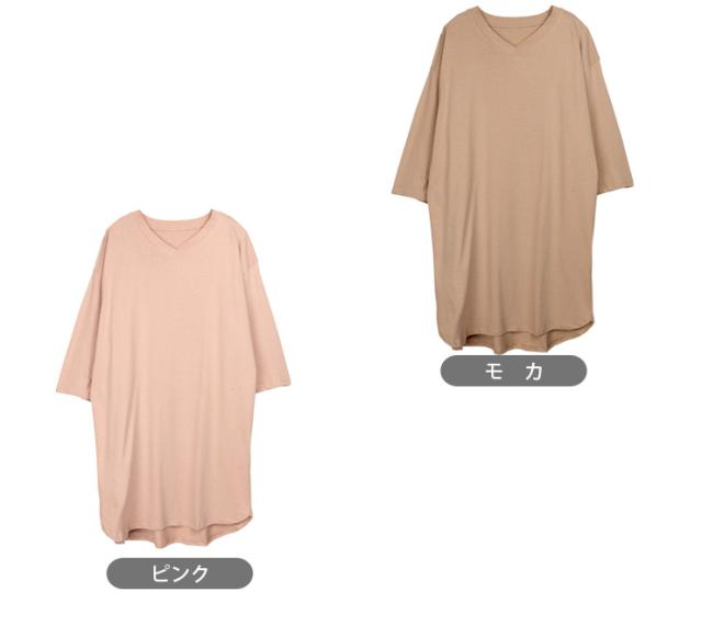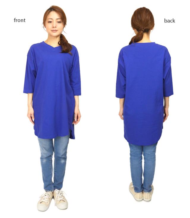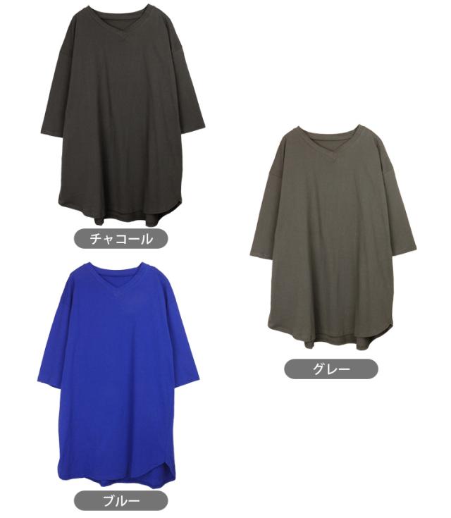 【メール便送料無料】Vネックラウンド裾 BIG Tシャツ レディース M〜L 81536-2 全5色 半袖 五分袖 七分袖 ロング丈 無地 No.2533
