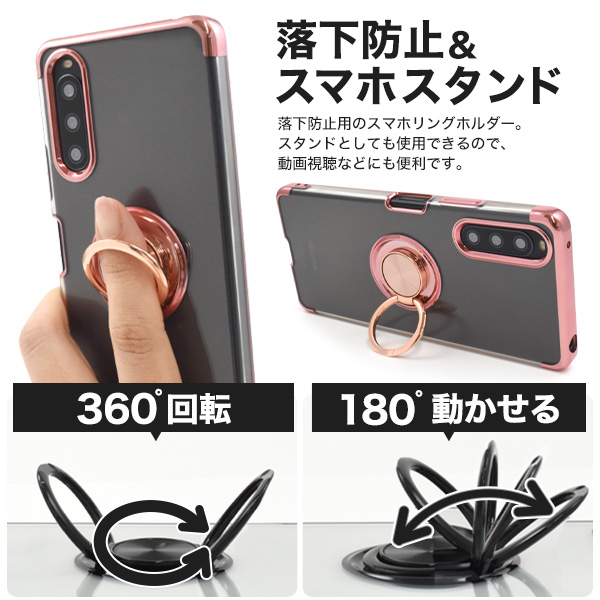 Xperiaシリーズ用 スマホリング付きメタルカラーバンパーソフトクリアケース落下防止用のスマホリングが付いた、メタルカラーバンパーソフトクリアケースです。リングホルダーは360度回転可能でスタンドとしても使用できます。