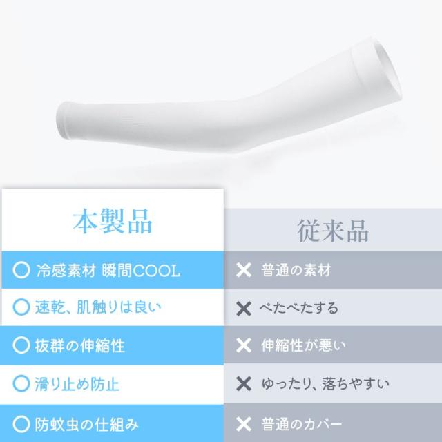 夏に蒸れず、快適な『 冷感アームカバー 』が登場。肌に接する面はひんやり冷感素材でさらっとした肌触り。他社より冷感生地を使用していますので、冷感機能を実現する上、着けた瞬間からヒンヤリとした冷感が続きます。(冷感効果は時間の経過と体温により、中和されていきます。熱が移動する接触冷感の性質上の仕様です。)