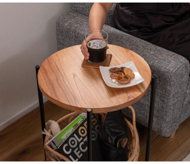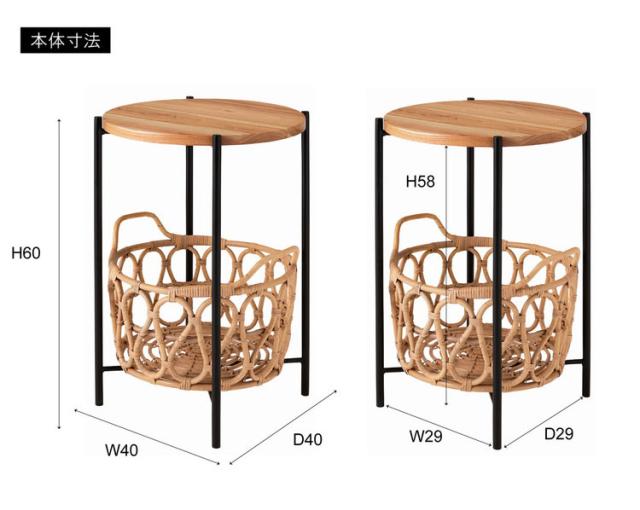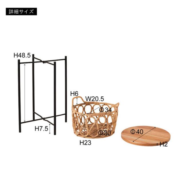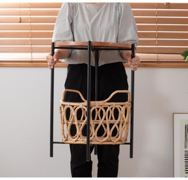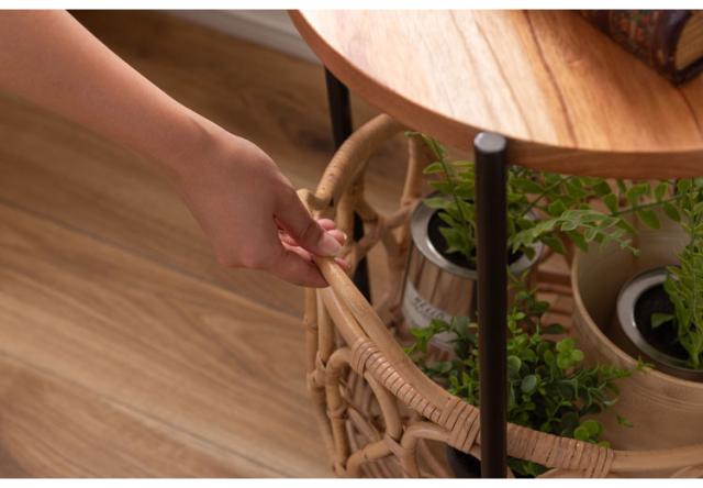 天板のウッドやバスケットのラタン素材があたたかさを演出しながら脚部にスチールを使用する事で引き締まった印象に。