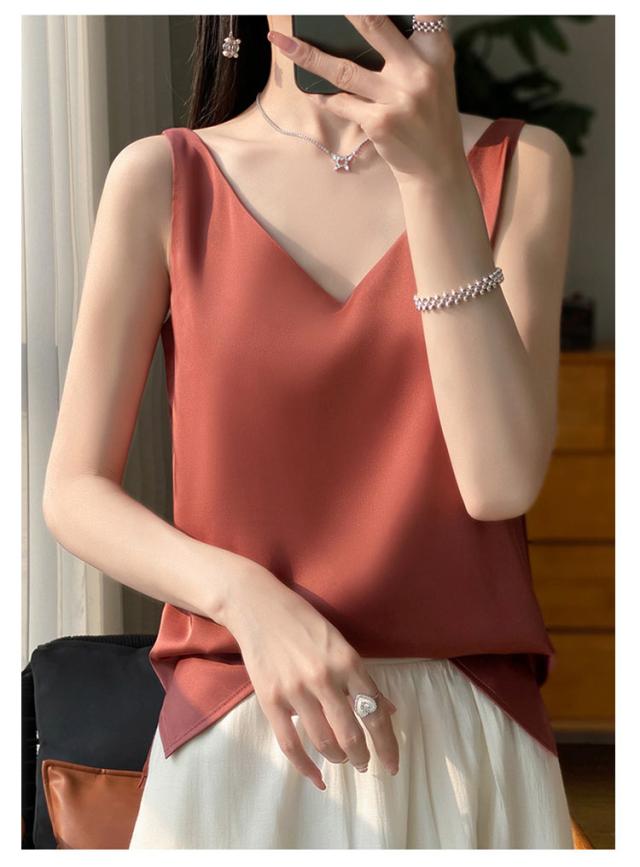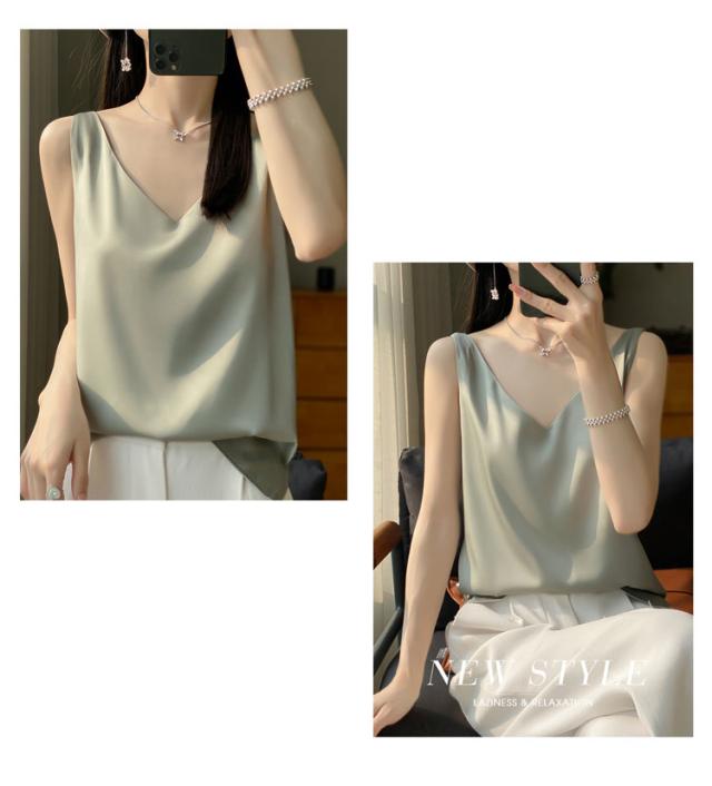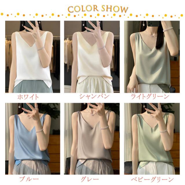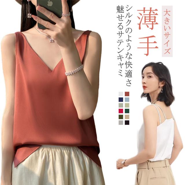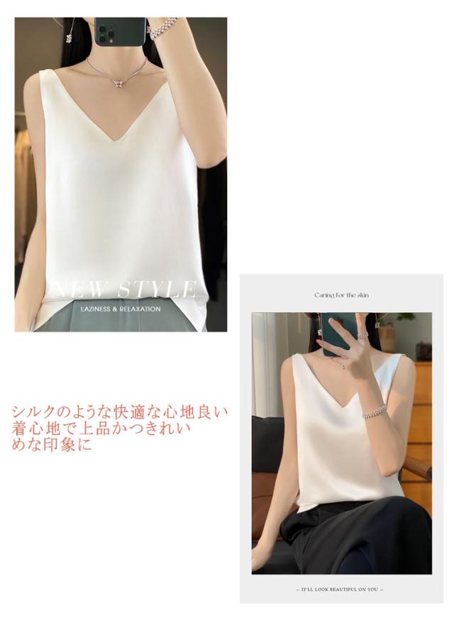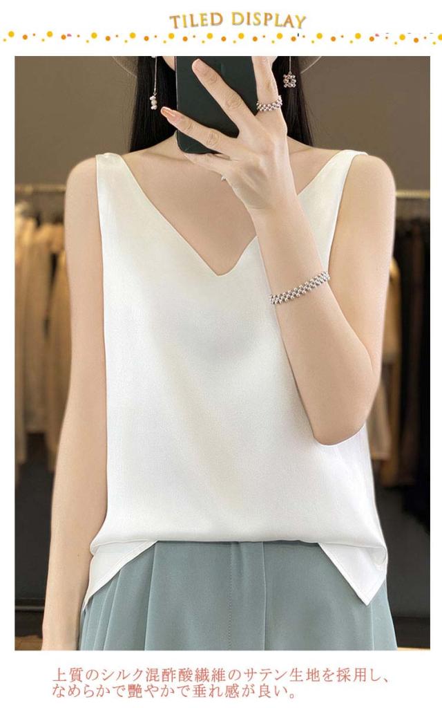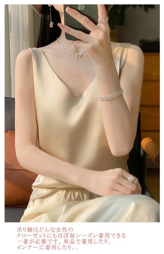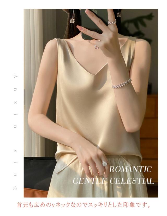 タンクトップ サテン レディース シルク Vネック ブラウス 重ね着 トップス サテンスリップ インナーキャミソール インナーキャミソール 無地 光沢 オフィス セクシー 上品 フォーマル 見せインナー 薄手 下着 肌着
