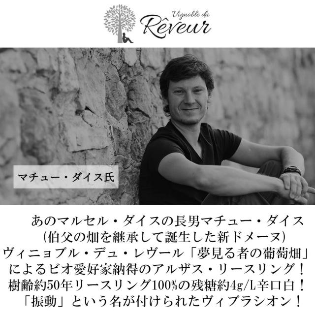あのマルセル・ダイスの長男マチュー・ダイス (伯父の畑を継承して誕生した新ドメーヌ) ヴィニョブル・デュ・レヴール「夢見る者の葡萄畑」 によるビオ愛好家納得のアルザス・リースリング! 樹齢約50年リースリング100%の残糖約4g/L辛口白! 「振動」という名が付けられたヴィブラシオン!