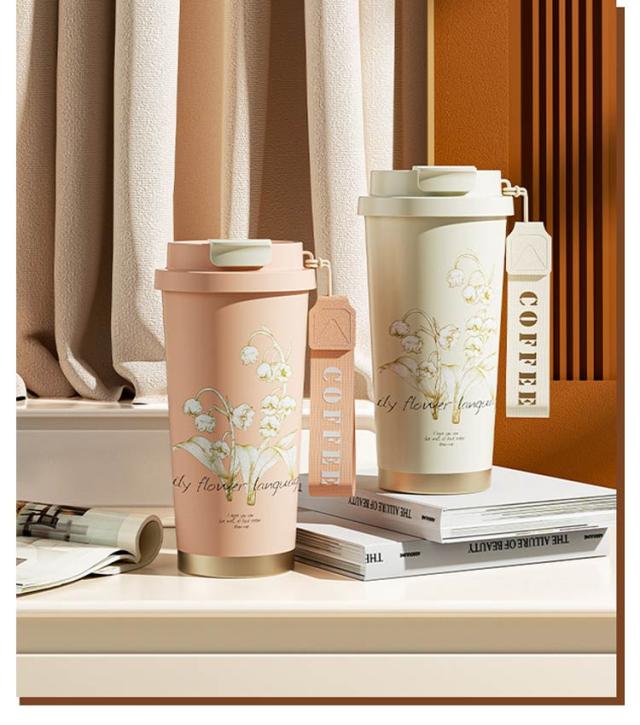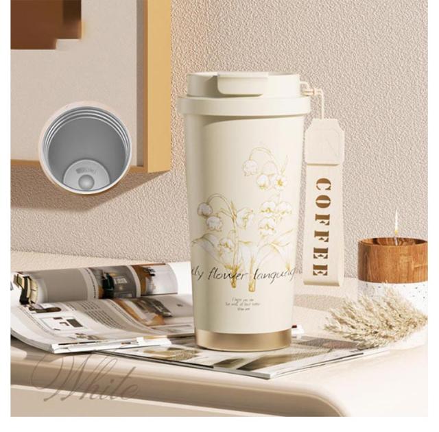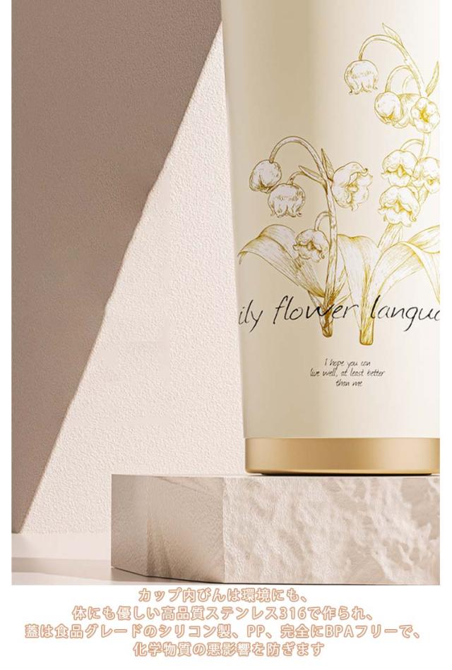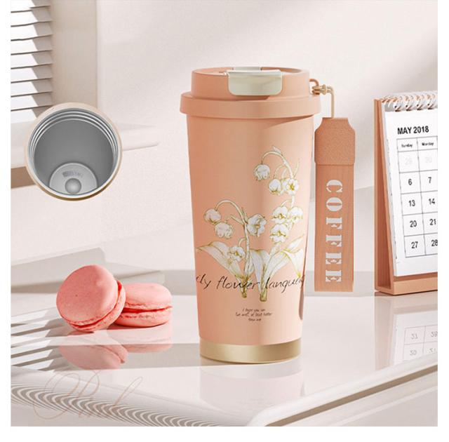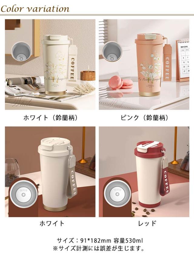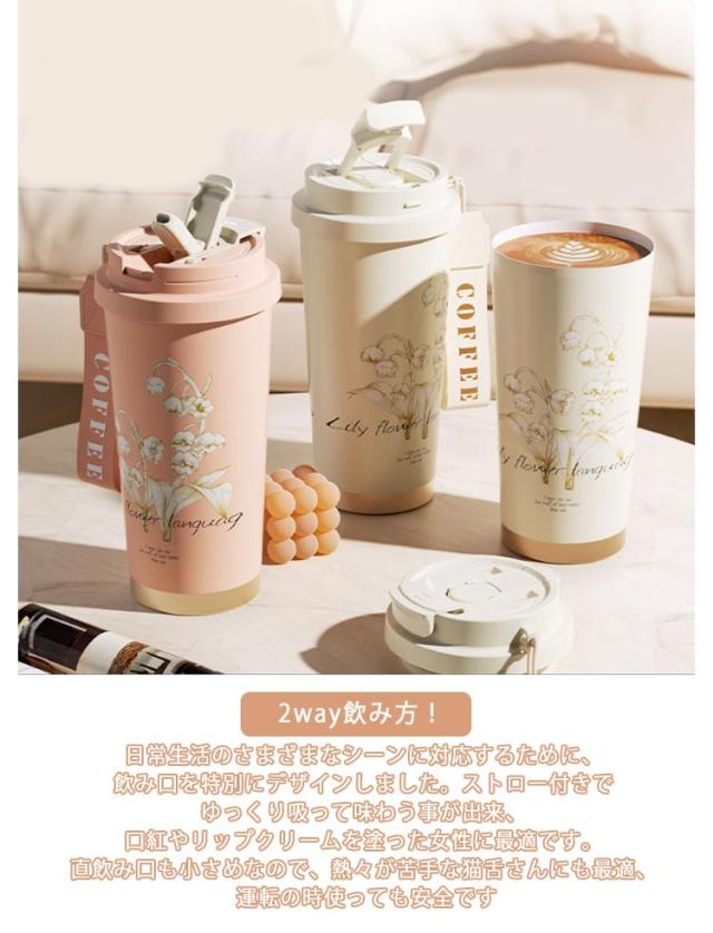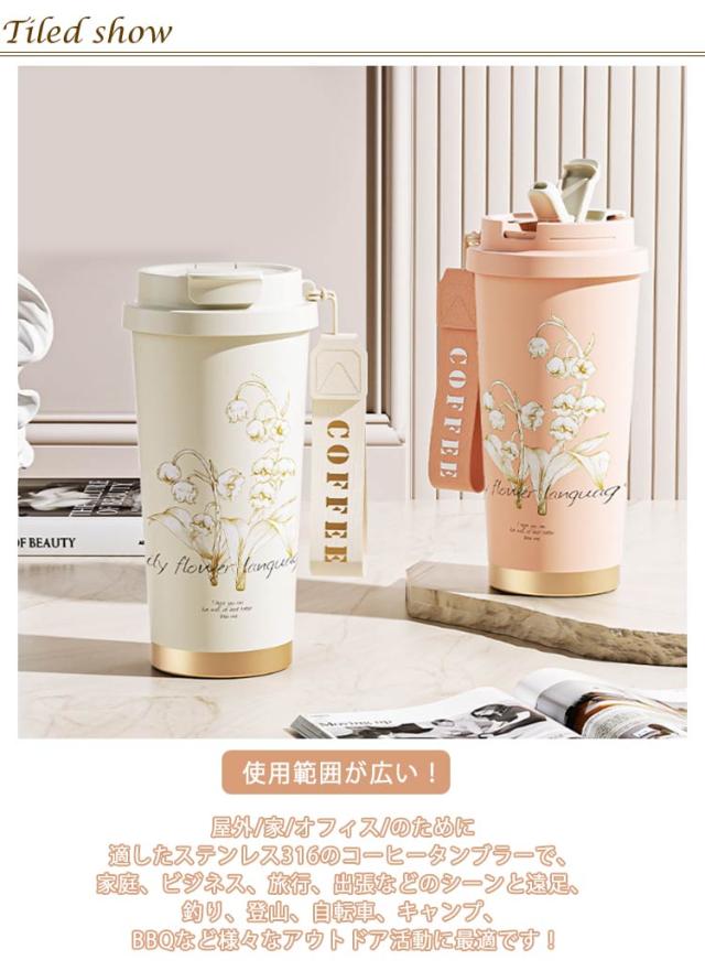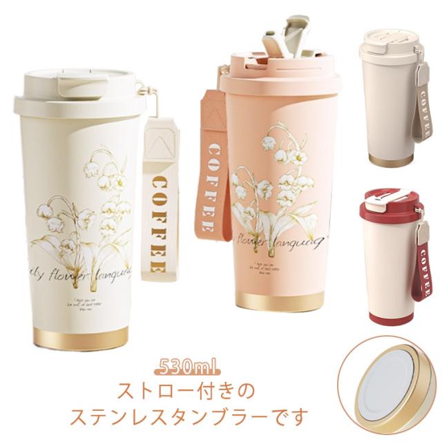 ストロー付きタンブラー 水筒 直飲み タンブラー 530ml コーヒータンブラー 鈴蘭柄 マグボトル 保温 3way タンブラー 大容量 ストロー付き 持ち運び 漏れ防止 魔法瓶 車カップホルダー対応 保冷 真空二重断熱 ステンレス 広口 アウトドア オフィス 運転