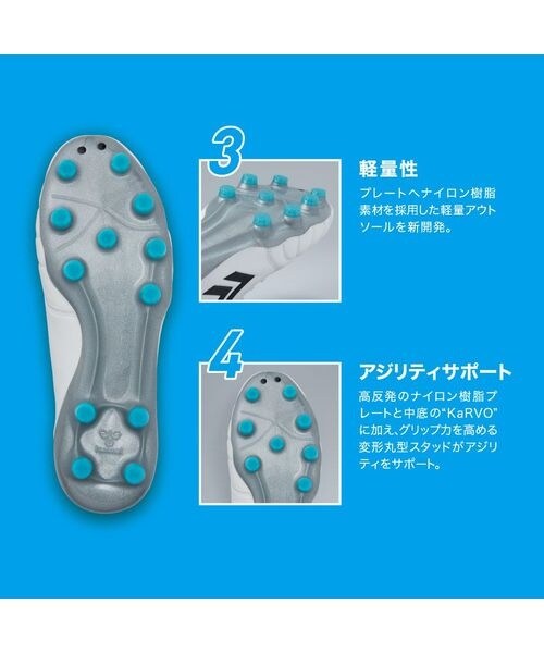 アッパー前足部にカンガルーレザー、中足部以降にしなやかな人工皮革「ナノフィットスキン」を採用することで優れたフィッティングを実現。アウトソールは軽量性・反発性に優れたナイロン樹脂をベースに、スタッド部分へ耐摩耗性に優れたウレタン樹脂を採用。変形丸型スタッドがグリップ性を向上。2E相当のレギュラーラストを採用。
