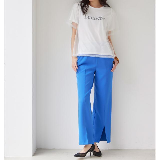 ・ロゴTにチュールのシアー素材を重ねたレイヤードTシャツ。