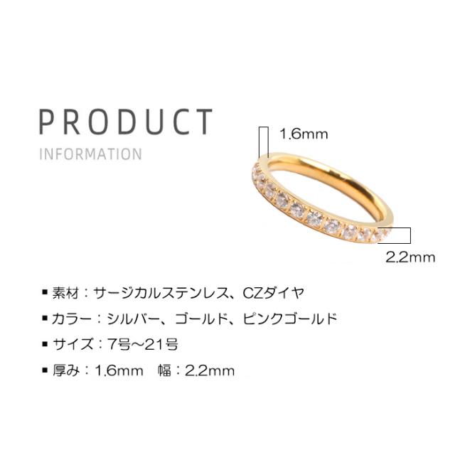 変色しにくい、変形しにくい、傷が付けにくい、 金属アレルギーに強いサージカルステンレスの指輪です。 フルエタニティリングの魅力は、どの角度から見ても宝石がキラキラと輝いていることです。 途切れることなく宝石が施されていることからEternity(永遠)ringと呼ばれ、永遠に変わらない愛を込め、結婚記念日などに夫から妻へ贈られるアニバーサリーリングとしても人気です。 シンプルなデザインだから、普段使いにもピッタリです。 日常使いからフォーマルな場面まで様々な場面で活躍してくれます。 |