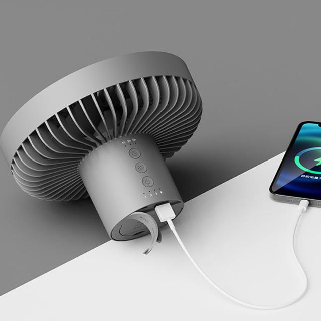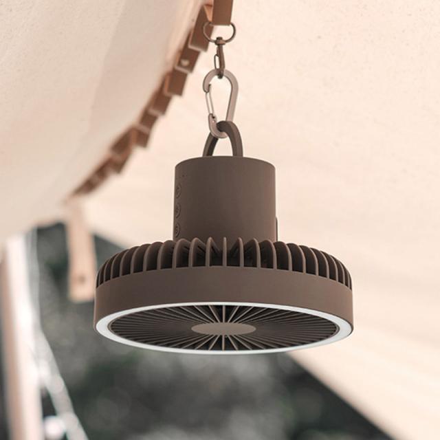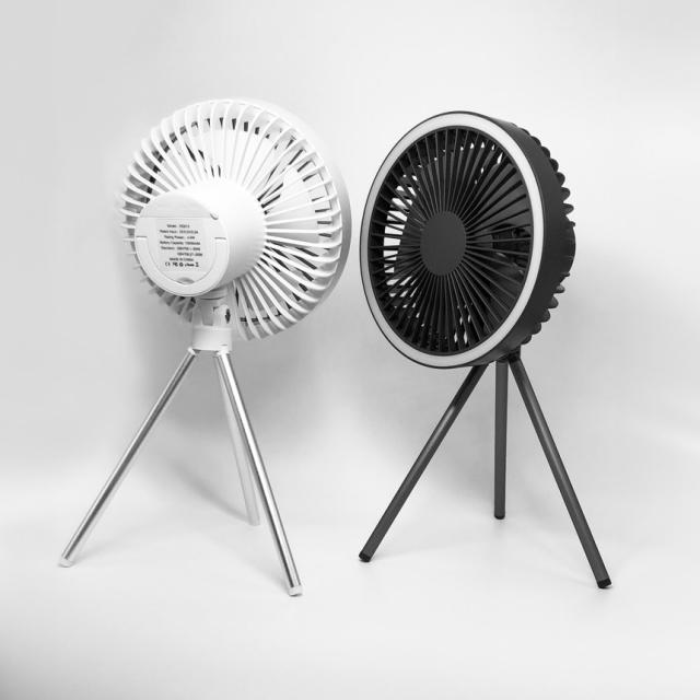三脚で卓上使いや持ち運び、取り外して収納も便利。また、付属のカラビナを利用して、吊り下げて使うこともできるので、サーキュレーターや電灯として、とっても便利。キャンプのテントの中でも役立ちます。