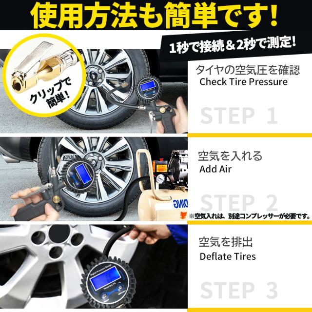 【一台3役】空気充填・タイヤ圧測定・空気抜き3つの機能が備わっており、常にタイヤの状態を確認でき安全運転をサポートします。(※空気充填の場合は別途エアコンプレッサーが必要です。)