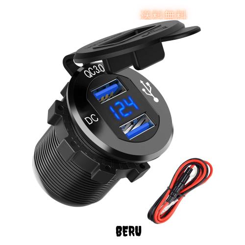 バイク用 チャージャー USB充電器 防水 QC 3.0 カーパワーソケット デュアル 2 ポート 36W 急速充電LED電圧計 12V / 24V 車/バイク/オー