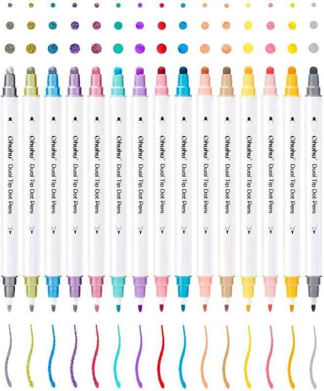 Ohuhu ドットペン 15色セット 0.5mm 押し ドットマーカー メタリックと基本色 ドット カラーペン 水性ペン お絵かきセット DIY メモ 塗り絵 落書き