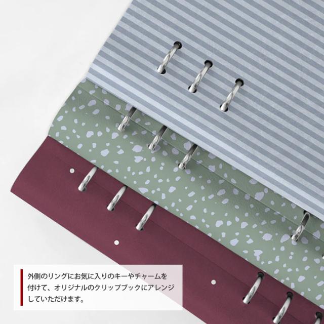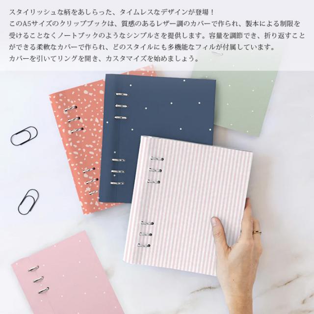 | 商品説明 | スタイリッシュな柄をあしらった、タイムレスなデザインが登場!このA5サイズのクリップブックは、質感のあるレザー調のカバーで作られ、製本による制限を受けることなくノートブックのようなシンプルさを提供します。容量を調節でき、折り返すことができる柔軟なカバーで作られ、どのスタイルにも多機能なフィルが付属しています。カバーを引いてリングを開き、カスタマイズを始めましょう。 |