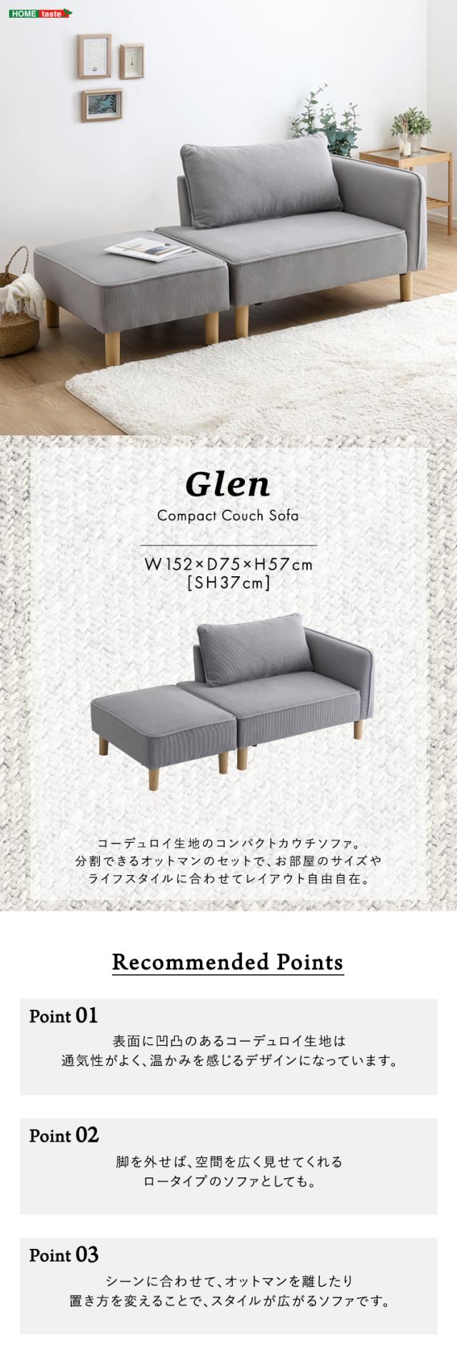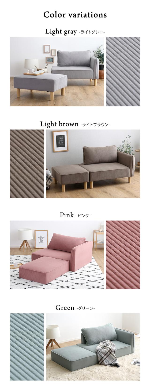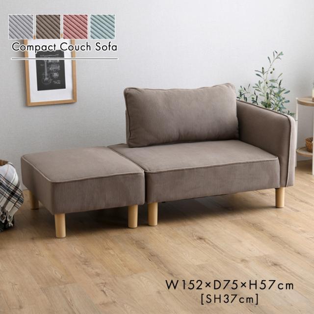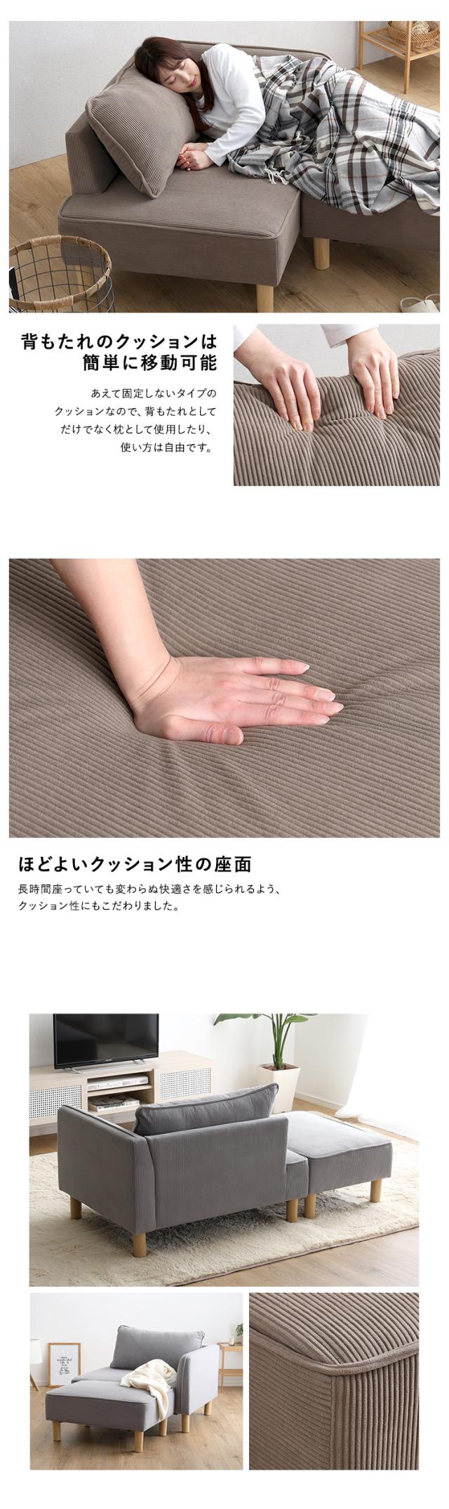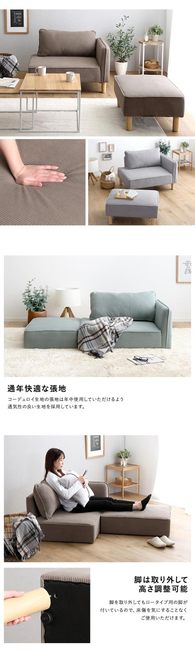 コンパクトカウチソファ ライトグレー 全4色 コーデュロイ生地 シェーズロング オットマン 木製脚 脚取外し可能 ローソファ