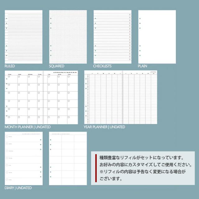 | セット内容 | 表紙、罫線用紙15枚、方眼用紙15枚、無地用紙15枚、折り畳み式日付なし年間予定表(両面)1枚、折り畳み式日付なし月間予定表(両面)6枚、日付なし見開き1週間ダイアリー13枚、タスク/To Do 5枚 ※セット内容はリストや商品画像と異なることがあります。 ※市販のリフィルもご利用頂けます。 |