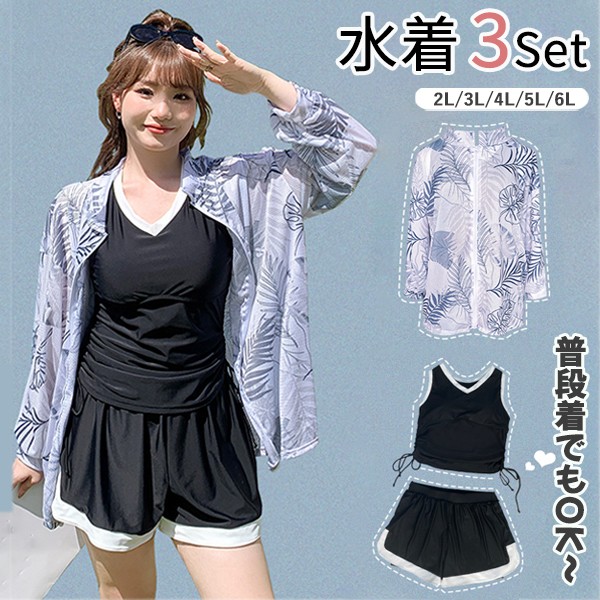 3点セット タンキニ 水着 レディース 体型カバー 大きいサイズ ラッシュガード 長袖 プラスサイズ セパレート 露出控えめ インナーパンツ ワイヤーなし パッド付 短パン 海 プール リゾート おしゃれ ぽっちゃり 水陸両用 韓国風 大人 女性用 ジュニア 普段着