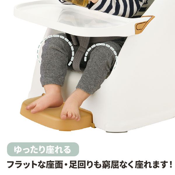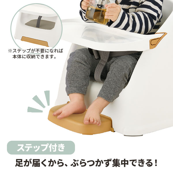 足がぶらつかない!ステップ付きステップに両足がつくことで足がブラつかず、落ち着いて食事に集中できます。