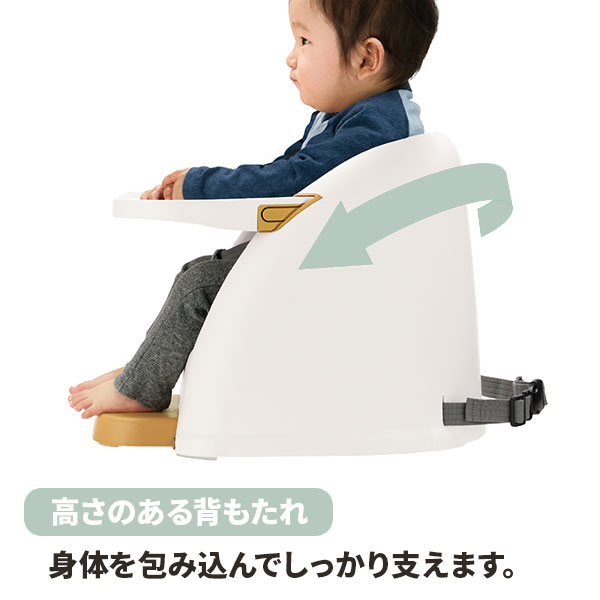 背もたれ、ステップ、座面シートで姿勢をサポートするブースターチェア。