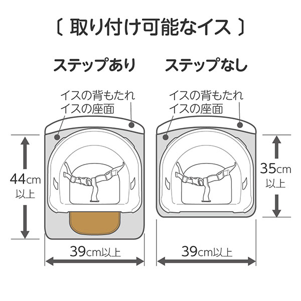 取り付け可能なイスステップあり時/座面の幅39cm以上・奥行44cm以上 ステップなし時/座面幅39cm以上・奥行35cm以上