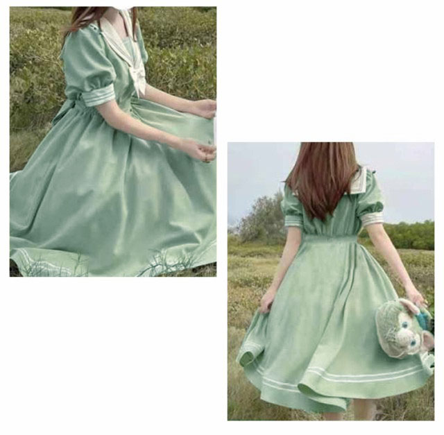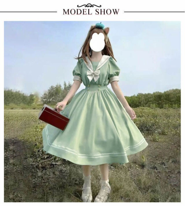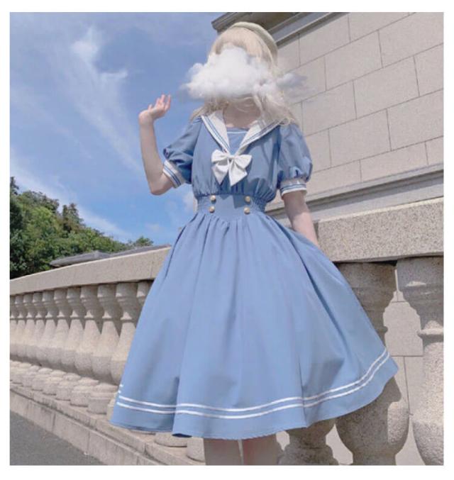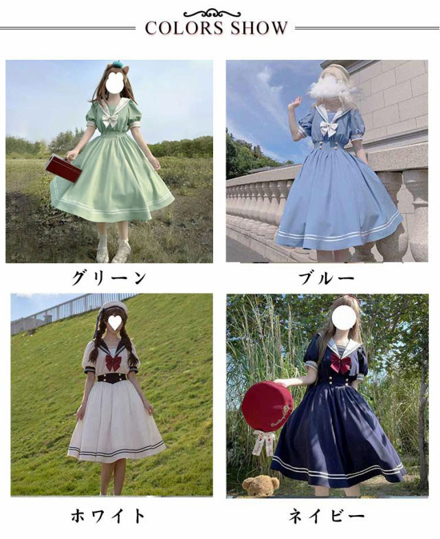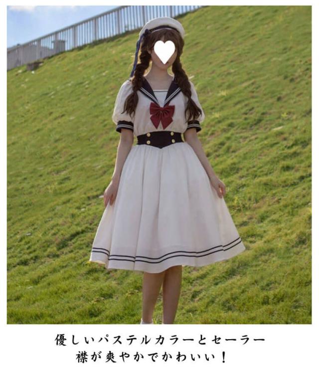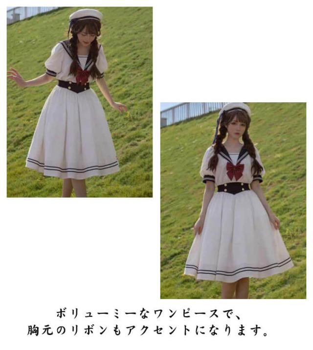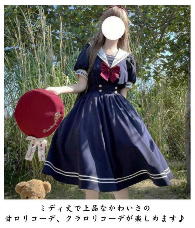 ロリータ ワンピース セーラー 襟付き ワンピース リボン フレア ひざ丈 衣装 半袖 レディース ブラウス シャツ マリン かわいい 大人 ガーリー 制服 学生 女子 JK 高校生 Aライン コスプレ メイド服 コスチューム