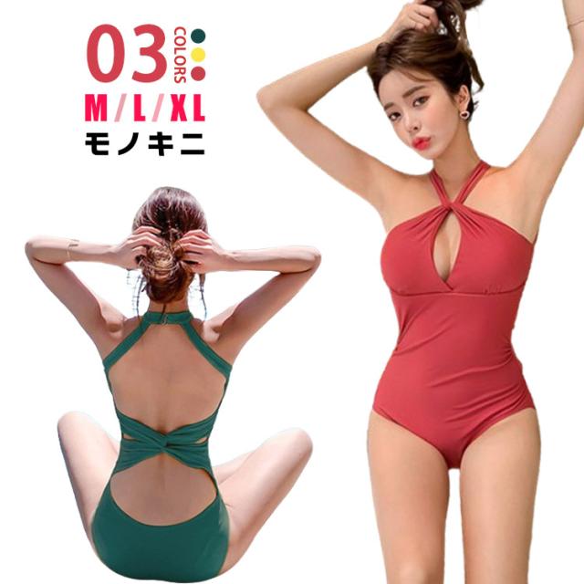 水着 レディース モノキニ ワンピース 谷間 セクシー 背中見せ ホルター クロス ツイストデザイン 無地 体型カバー ビキニ 韓国 水着 おしゃれ かわいい シンプル 大人女子 ビーチ プール 海 リゾート グリーン イエロー レッド