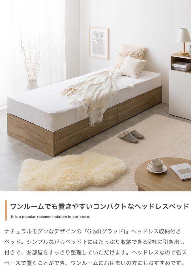 寝具 おしゃれ Glad ヘッドレス収納付きベッド 高密度アドバンスポケットコイルセット S ナチュラル モダン 引き出し 大容量 省スペース キャスター付き 組立式