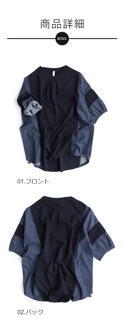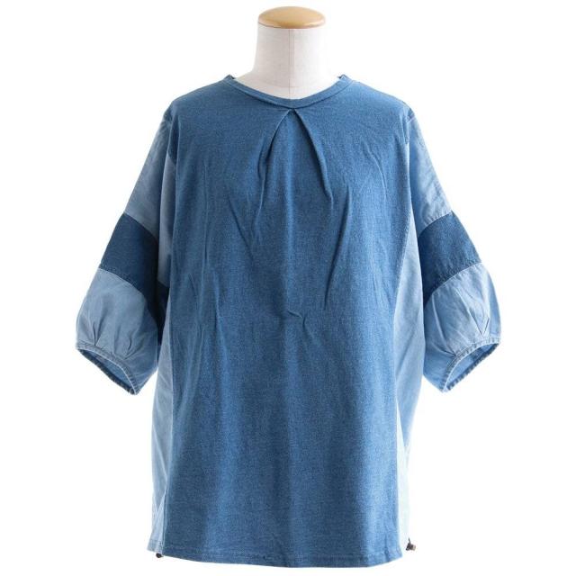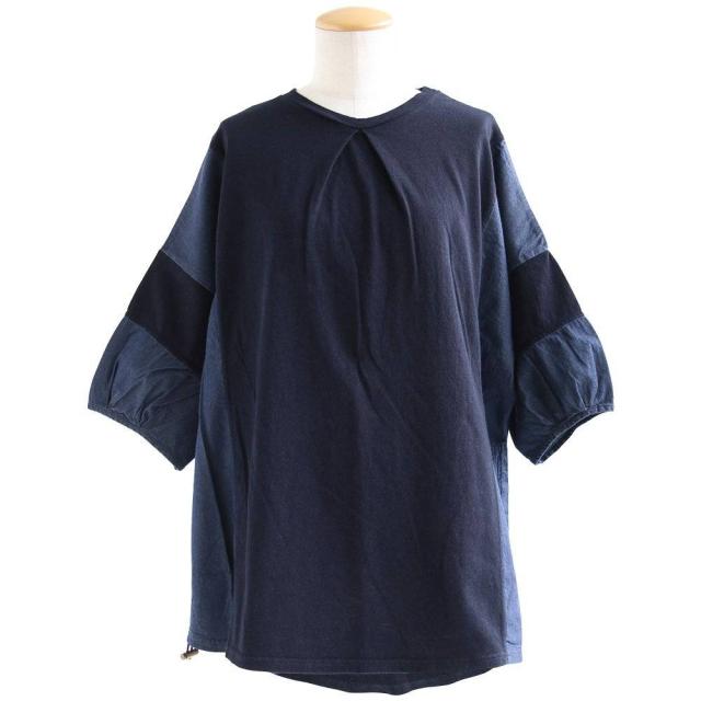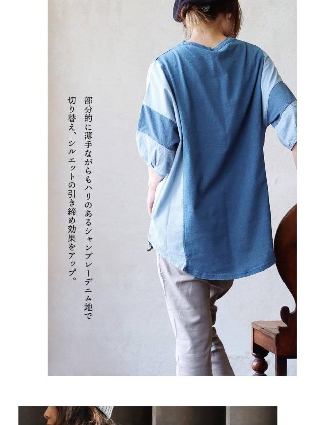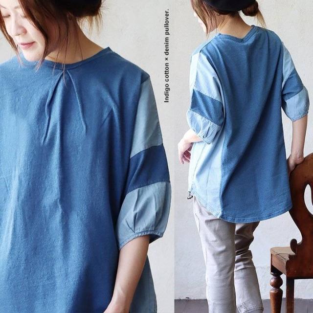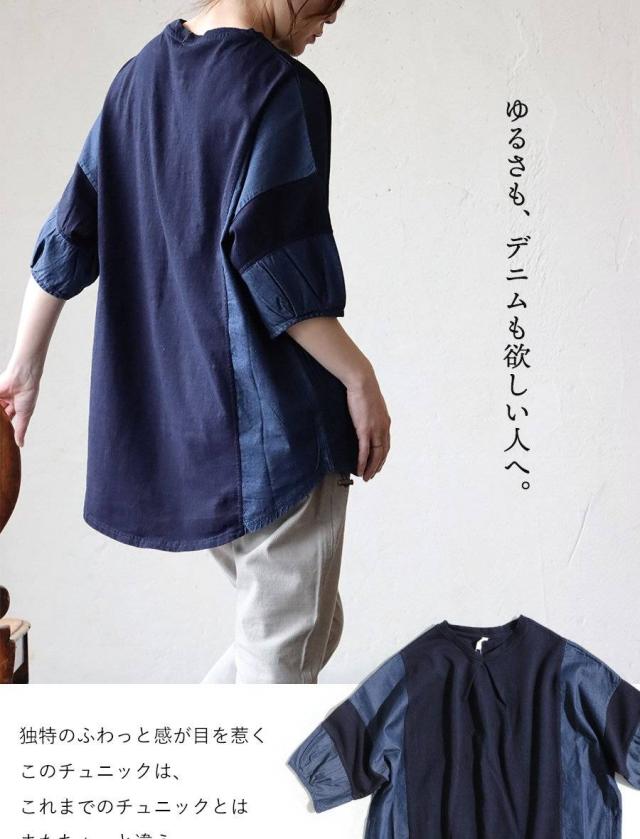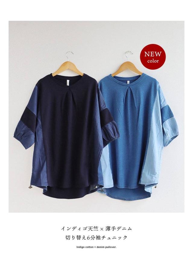 プルオーバー デニム 風 チュニック 6分袖 レディース カットソー夏 夏服 インディゴ 天竺 綿100% 薄手 配色切り替え 着痩せ 二の腕 体系 カバー バルーンスリーブ 半端袖 かっこいい カジュアル パティ