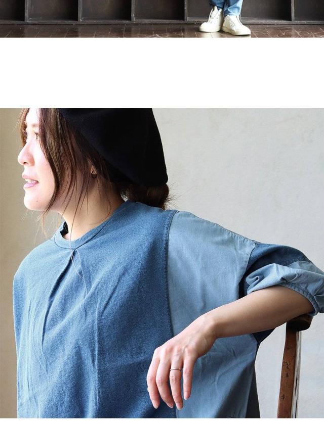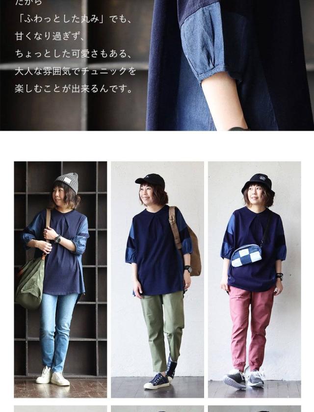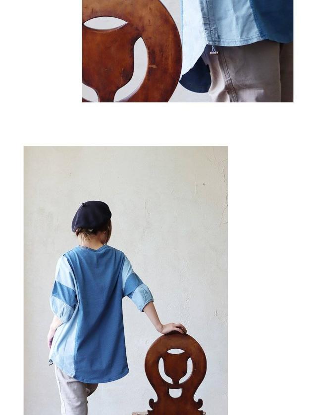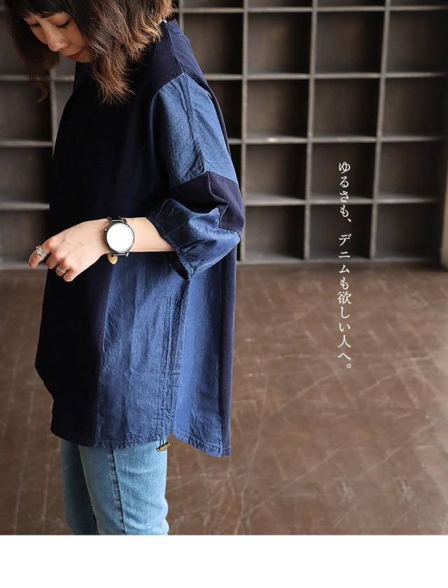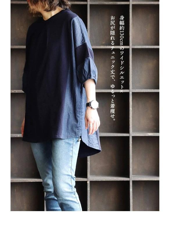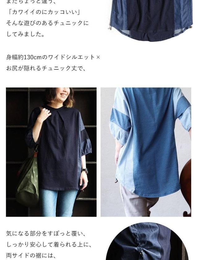 プルオーバー デニム 風 チュニック 6分袖 レディース カットソー夏 夏服 インディゴ 天竺 綿100% 薄手 配色切り替え 着痩せ 二の腕 体系 カバー バルーンスリーブ 半端袖 かっこいい カジュアル パティ